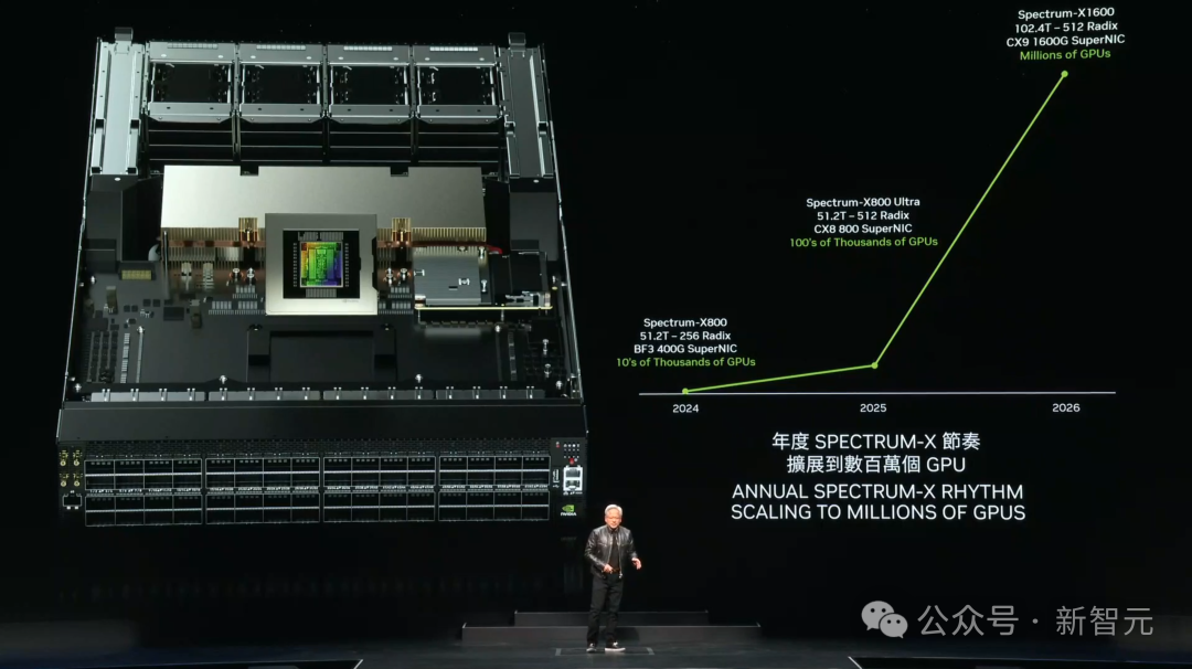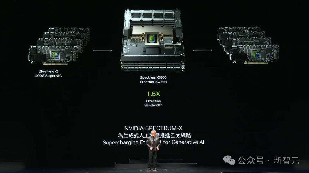 老黄拿在手里的,是一个NVLink的主干,用老黄的原话说,它是一个「电气机械奇迹」NVLink做到的仅仅是将不同GPU芯片连接在一起,于是老黄又说了一句「这还不够宏大」。要连接超算中心内不同的主机,最先进的技术是「无限带宽」(InfiniBand)。但很多数据中心的基础设施和生态,都是基于曾经使用的以太网构建的,推倒重来的成本过高。因此,为了帮助更多的数据中心顺利迈进AI时代,英伟达研发了一系列与AI超算适配的以太交换机。网络级RDMA、阻塞控制、适应性路由、噪声隔离,英伟达利用自己在这四项技术上的顶尖地位,将以太网改造成了适合GPU之间点对点通信的网络。由此也意味着,数百万GPU数据中心的时代,即将到来。