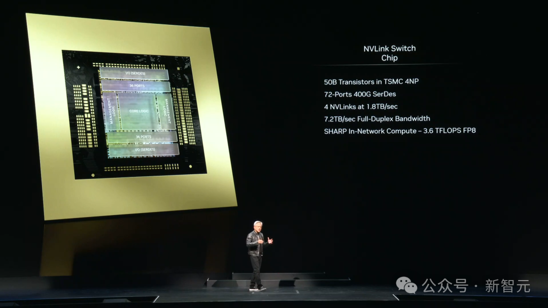 NVLink将这些单独的GPU彼此连接起来,因此我们就得到了72个GPU的MGX介绍完芯片,老黄特意提到了英伟达研发的NVLink技术,这也是英伟达的主板可以越做越大的重要原因。由于LLM参数越来越多、越来越消耗内存,想要把模型塞进单个GPU已经几乎是不可能的事情,必需搭建集群。其中,GPU通信技术的重要性不亚于计算能力。英伟达的NVLink,是世界上最先进的GPU互连技术,数据传输速率可以堪称疯狂!因为如今的DGX拥有72个GPU,而上一代只有8个,让GPU数直接增加了9倍。而带宽量,则直接增加了18倍,AI FLops增加了45倍,但功率仅仅增加了10倍,也即100千瓦。人们之所以意识到它的重要性,是因为它将所有这些不同的GPU连接在一起,从而能够让十万亿参数的LLM运行起来。500亿个晶体管,74个端口,每个端口400GB,7.2TB每秒的横截面带宽,这本身就是个奇迹。而更重要的是,NVLink内部还具有数学功能,可以实现归约。对于芯片上的深度学习,这尤其重要。有趣的是,NVLink技术,大大拓宽了我们对于GPU的想象。支撑着72个GPU的骨架,就是NVLink的5000根电缆,能够在传输方面节省20kw的功耗用于芯片计算。