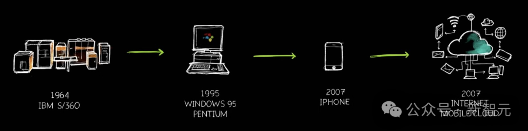 这一切都是物理世界中的模拟,它的实现,得益于两项基本的技术——加速计算和人工智能,将重塑计算机产业。到目前为止,计算机行业已有60多年的历史,而现在,一个全新的计算时代已然开始。1964年,IBM的System 360首次引入了CPU,通用计算通过操作系统将硬件和软件分离。架构兼容性、向后兼容性等等,所有我们今天所了解的技术,都是从这个时间点而来。直到1995年,PC革命开启让计算走进千家万户,更加民主化。2007年,iPhone推出直接把「电脑」装进了口袋,并实现了云端链接。可以看出,过去60年里,我们见证了2-3个推动计算行业转变的重要技术节点。加速计算:一手GPU,一手CUDA