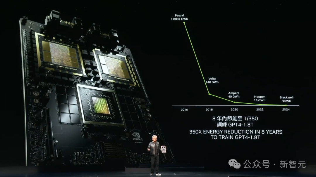 接下来就让我们看看,英伟达是如何将一颗颗地表最强的Blackwell芯片,变成一座座超级「AI工厂」的。注意看,下面这块是搭载了Blackwell GPU的量产级主板。而在这里,我们可以清晰地看到,两个连在一起的Blackwell芯片。在8年里,每一代英伟达芯片的Flops,都增长了1000倍。即使和摩尔定律最好的时刻相比,Blackwell算力的提升也是惊人的。比如,训练一个1.8万亿参数、8万亿token的GPT-4所用的能耗,直接降至1/350!Pascal需要消耗的,是1000吉瓦时,这就意味着,它需要一个1000吉瓦的数据中心。