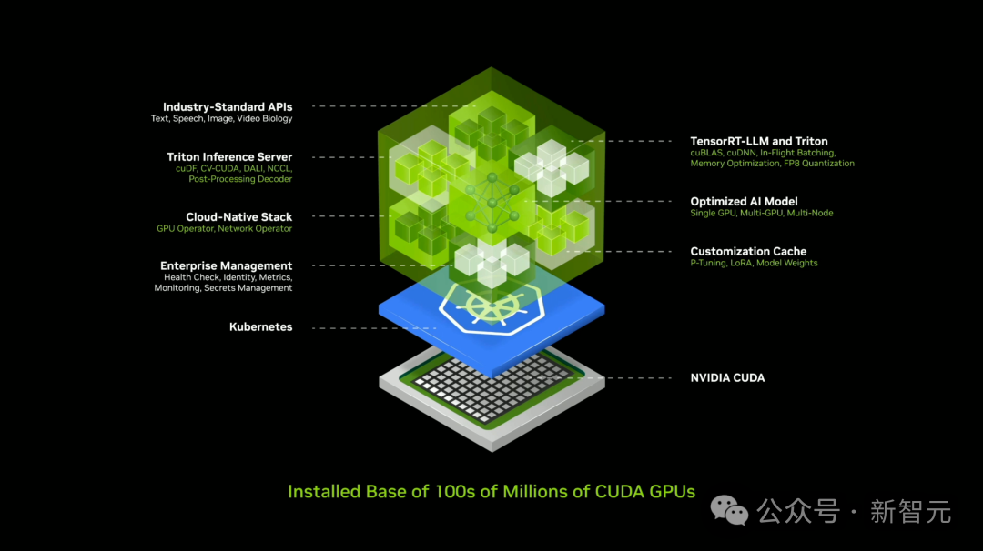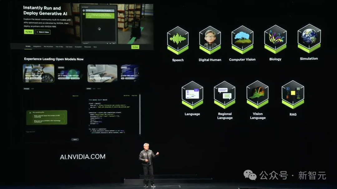 在英伟达的AI工厂中,运行着可以加速计算推理的新型软件——NIM。这个容器里有大量的软件,其中包括用于推理服务的Triton推理服务器、优化的AI模型、云原生堆栈等等。现场,老黄再一次展示了全能AI模型——可以实现全模态互通。有了NIM,这一切都不是问题。它可以提供一种简单、标准化的方式,将生成式AI添加到应用程序中,大大提高开发者的生产力。现在,全球2800万开发者都可以下载NIM到自己的数据中心,托管使用。未来,不再耗费数周的时间,开发者们可以在几分钟内,轻松构建生成式AI应用程序。与此同时,NIM还支持Meta Llama 3-8B,可以在加速基础设施上生成多达3倍的token。这样一来,企业可以使用相同的计算资源,生成更多的响应。而基于NIM打造的各类应用,也将迸发涌现,包括数字人、智能体、数字孪生等等。老黄表示,「NVIDIA NIM集成到各个平台中,开发人员可以随处访问,随处运行 —— 正在帮助技术行业使生成式 AI 触手可及」。智能体组队,万亿美元市场