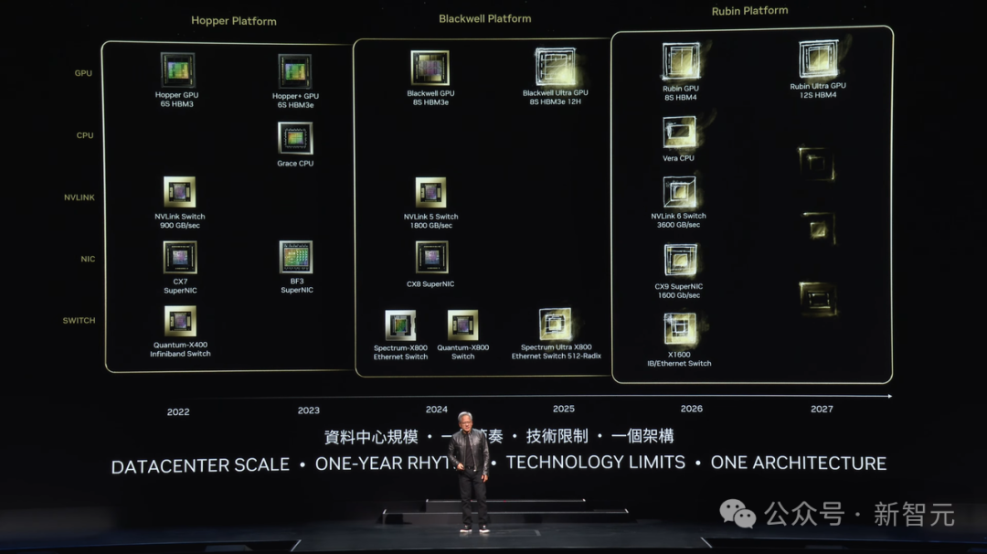 同时公开的Blackwell后三代路线图:Blackwell Ultra(2025年),Rubin(2026年),Rubin Ultra(2027年)