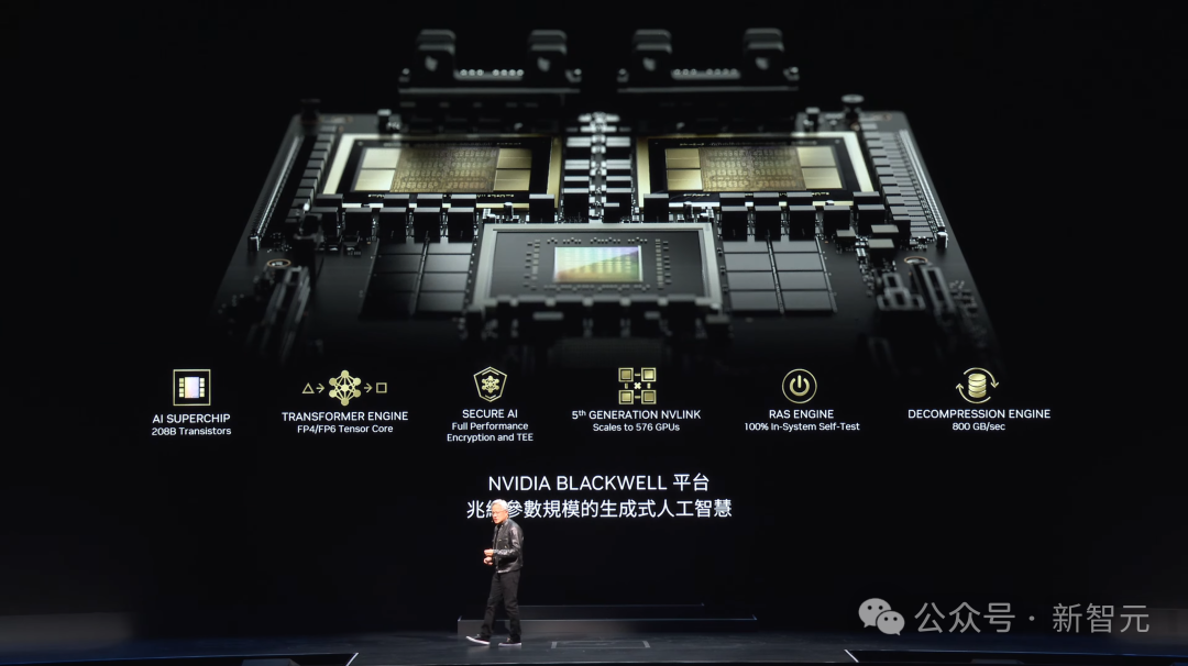 (1吉瓦=1000兆瓦)而且如果这样的数据中心真的存在的话,训练也GPT-4也需要整整一个月的时间。这也就是为什么,ChatGPT这样的LLM, 在八年前是根本不可能存在的。如今有了Blackwell,过去的1000吉瓦时直接可以降到3吉瓦时。可以说,Blackwell就是为了推理,为了生成token而生的。它直接将每token的能量降低了45000倍。在以前,用Pascal产生1个token的消耗,相当于两个200瓦的灯泡运行2天。让GPT-4生成一个单词,大概需要3个token。这根本不可能让我们得到如今和GPT-4聊天的体验。而现在,我们每个token可以只使用0.4焦耳,用很少的能量,就能产生惊人的token。当我们从DGX扩展到大型AI超算,Transformer可以在大规模数据集上训练。而下一代AI,则需要理解物理世界。然而如今大多数AI并不理解物理规律。其中一种解决办法,是让AI学习视频资料,另一种,则是合成数据。第三种,则是让计算机互相学习!本质上就和AlphaGo的原理一样。巨量的计算需求涌来,如何解决?目前的办法就是——我们需要更大的GPU。英伟达将两块目前能造出来的最大尺寸的芯片,用一条10TB/s的链路链接起来;然后再把它们放到同一个计算节点上,和一块Grace CPU相连。在训练时,它被用于快速检查点;而在推理和生成的场景,它可以用于储存上下文内存。而且,这种第二代GPU还有高度的安全性,我们在使用时完全可以要求服务器保护AI不受偷窃或篡改。并且,Blackwell中采用的是第5代NVLink。通过该系统,我们可以测试每一个晶体管、触发器、片上内存和片外内存,因此我们可以当场确定某个芯片是否出现故障。基于此,英伟达将拥有十万个GPU超算的故障间隔时间,缩短到了以分钟为单位。因此,如果我们不发明技术来提高超算的可靠性,那么它就不可能长期运行,也不可能训练出可以运行数月的模型。如果提高可靠性,就会提高模型正常的运行时间,而后者显然会直接影响成本。最后,老黄表示,解压缩引擎的数据处理,也是英伟达必须做的最重要的事之一。通过增加数据压缩引擎、解压缩引擎,就能以20倍的速度从存储中提取数据,比现在的速度要快得多。超强风冷DGX & 全新液冷MGX