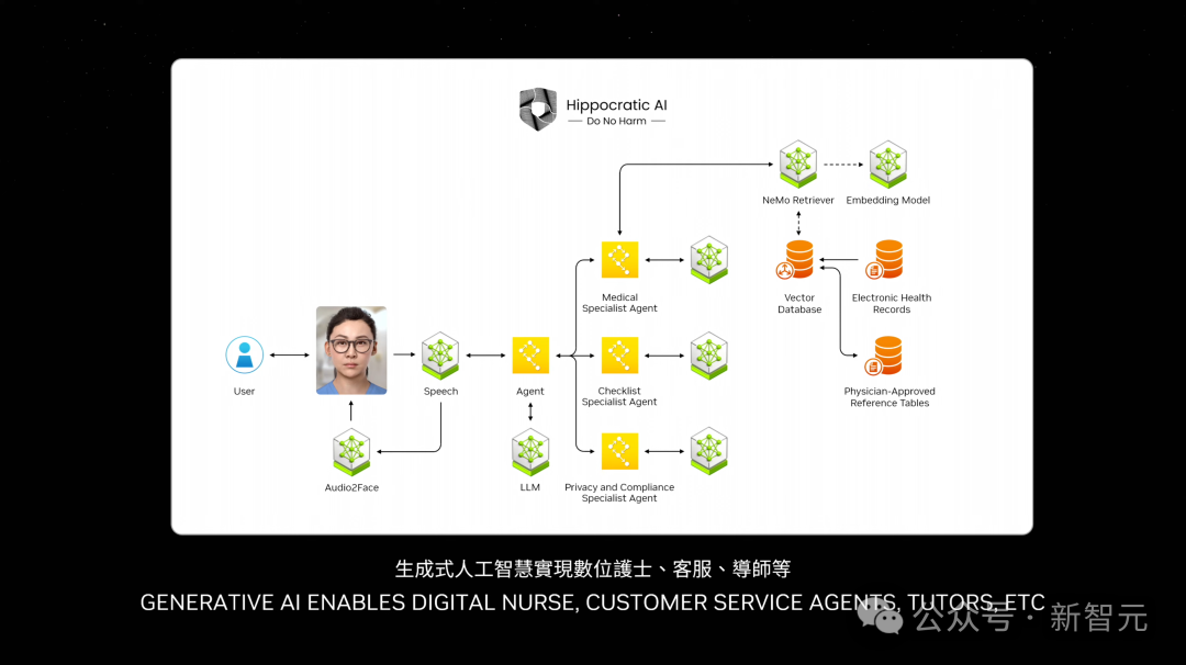 老黄称,几乎每个行业都需要客服智能体,有着万亿美元的市场前景。可以看到,在NIM容器之上,大多数智能体负责推理,去弄清任务并将其分解成多个子任务。还有一些,它们负责检索信息、搜索,甚至是使用工具等。未来,每家公司都将有大量的NIM智能体,通过连接起来组成一个团队,完成不可能的任务。GPT-4o躯壳,老黄做出来了