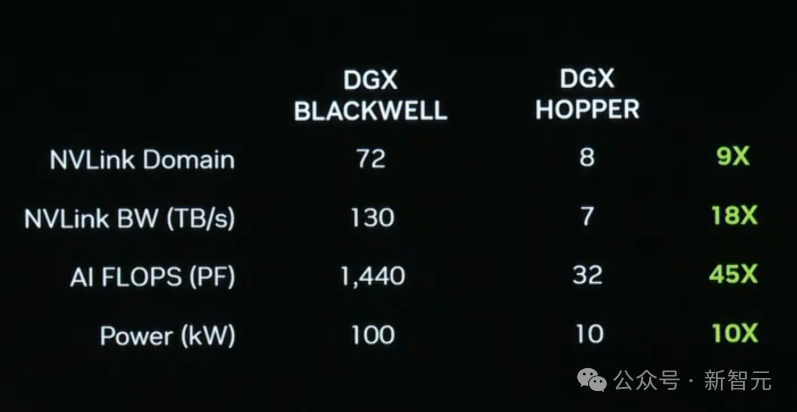 Blackwell是一个重大的跃进,但对老黄来说,这还不够大。英伟达不仅要做芯片,还要制造搭载最先进芯片的服务器。拥有Blackwell的DGX超算,在各方面都实现了能力跃升。集成了Blackwell芯片的最新DGX,能耗仅比上一代Hopper提升了10倍,但FLOPS量级却提升了45倍。