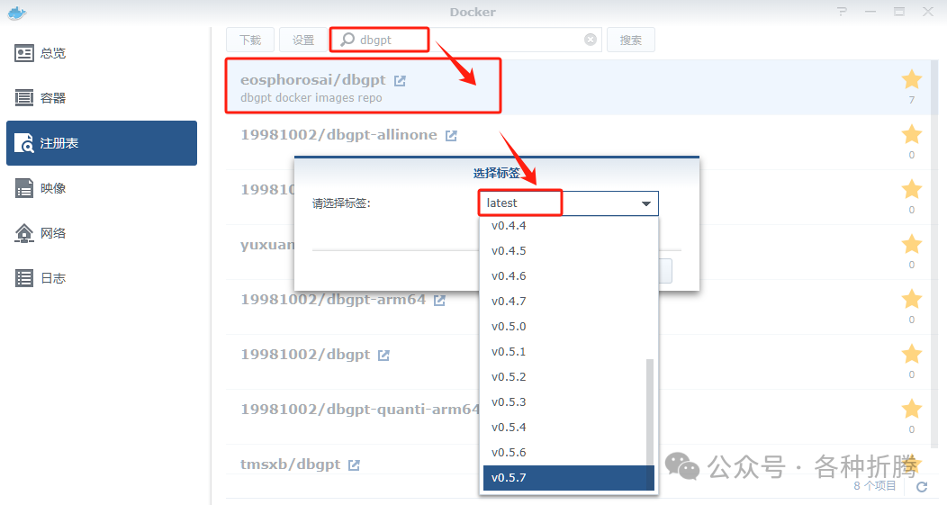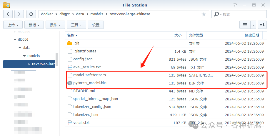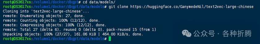 # 新建文件夹 dbgpt 和 子目录 mkdir -p /volume1/docker/dbgpt/data/models# 进入 dbgpt 目录 cd /volume1/docker/dbgpt# 进入 models 目录 cd data/models/# 下载 Embedding 模型 (需要git lfs) git clone https://huggingface.co/GanymedeNil/text2vec-large-chinese# 下载镜像 docker pull eosphorosai/dbgpt:latest如果不支持 git-lfs 的情况下,大文件只有 135 bytes