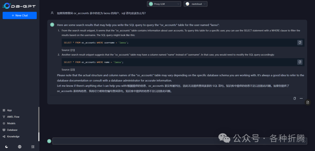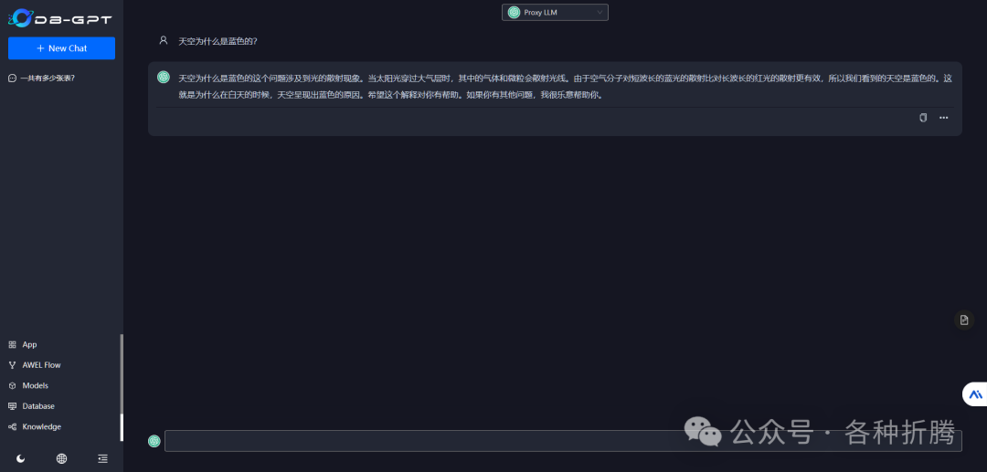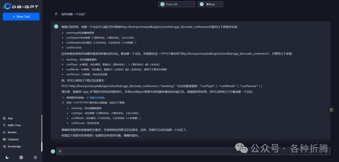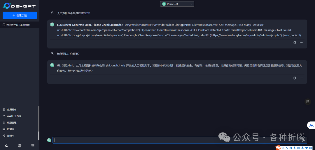 从上图我们可以看出来,proxyllm 等同于 chatgpt_proxyllm,所以是按 gpt-3.5-turbo 来请求的。这就是为什么前面要求给 kimi-free-api 增加模型名称的原因