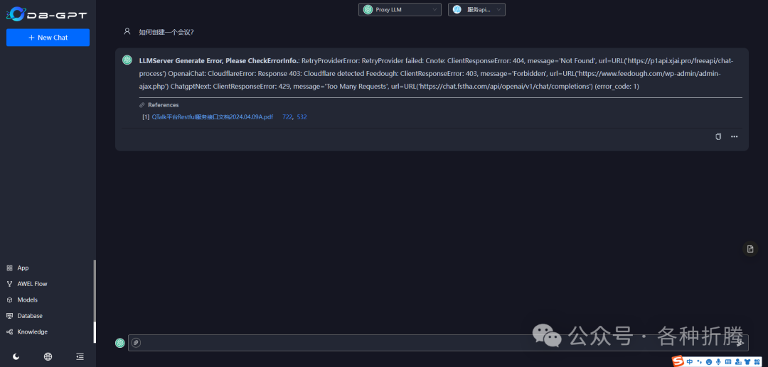 LLMServer Generate Error, Please CheckErrorInfo.: RetryProviderError: RetryProvider failed: Cnote: ClientResponseError: 404, message='Not Found', url=URL('https://p1api.xjai.pro/freeapi/chat-process') Feedough: ClientResponseError: 403, message='Forbidden', url=URL('https://www.feedough.com/wp-admin/admin-ajax.php') OpenaiChat: CloudflareError: Response 403: Cloudflare detected ChatgptNext: ClientResponseError: 429, message='Too Many Requests', url=URL('https://chat.fstha.com/api/openai/v1/chat/completions') (error_code: 1)文章传送门:在群晖上安装GPT4Free