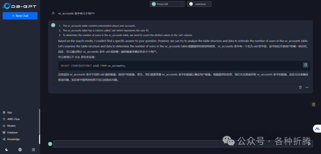 不太会用,随便问了个问题:oc_accounts 表中有几个用户?
