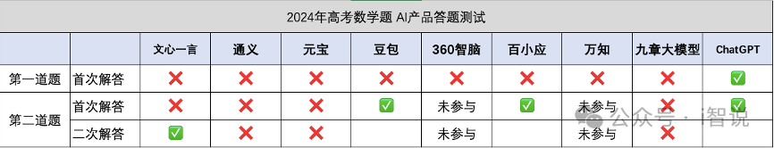 现在,我们再用百度文心一言、阿里通义、腾讯元宝、字节豆包、360智脑、ChatGPT,再加2款国产大模型产品百川智能百小应、零一万物万知,另外还有专攻K12数学的好未来(学而思母公司)的九章大模型,总计9大神器,来做2024年高考数学题,看看他们的水平如何,会不会翻车。