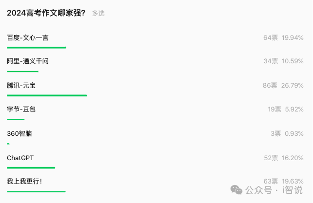 昨日,我们用百度文心一言、阿里通义、腾讯元宝、字节豆包、360智脑、ChatGPT这6大神器写了2024年高考全国语文新课标I卷的作文供大家赏析。截至目前,腾讯元宝获赞票数最多,百度文心一言排名第二。