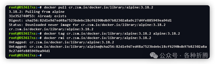 # 从代理拉取镜像 docker pull dockerproxy.com/library/alpine:3.18.2# 重命名镜像 docker tag dockerproxy.com/library/alpine:3.18.2 alpine:3.18.2# 删除代理镜像https://github.com/DaoCloud/public-image-mirror docker rmi dockerproxy.com/library/alpine:3.18.2然后将上面三条命令,通过 SSH 客户端连接到群晖后,逐条执行。不过现在大概率是👇这样的。可能是因为使用的人太多了?