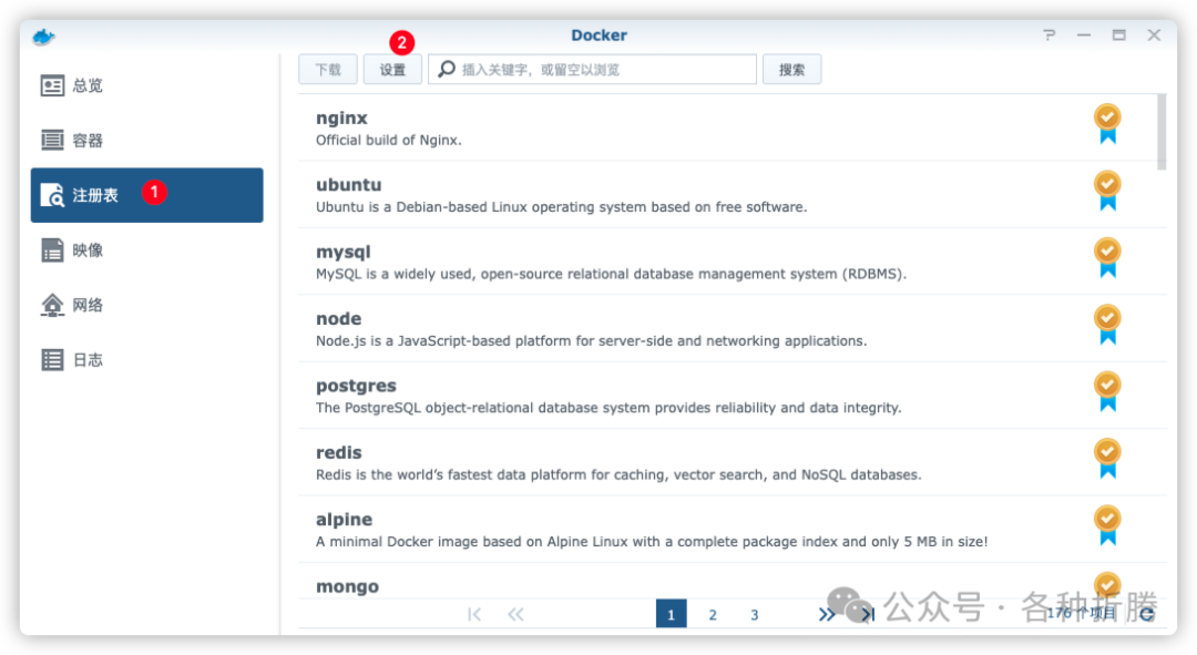 Error response from daemon: Get "https://registry-1.docker.io/v2/": net/http: request canceled while waiting for connection (Client.Timeout exceeded while awaiting headers)解决方案 方法一:设置镜像站点 群晖 Docker --> 注册表 --> 设置