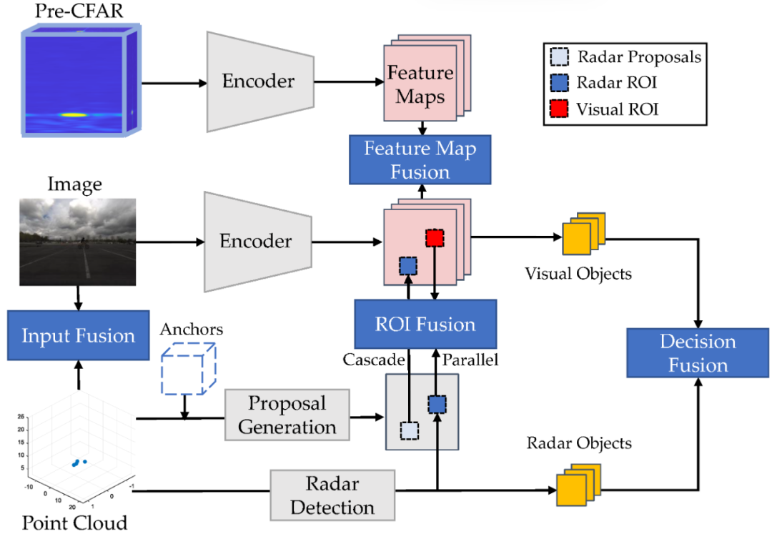 ROI融合改编自经典的两阶段检测框架。感兴趣区域(ROI)可以被认为是一组没有类别信息的目标候选者,融合架构可以进一步分为级联融合和并行融合。级联融合,直接利用雷达检测进行区域提议,将雷达点投影到图像视图中作为锚点anchor的候选位置,然后借助视觉语义确定ROI。这里可以采用两种技术来提高锚点质量。首先,向锚点添加了偏移量来模拟雷达检测的位置不精确性。为了减轻图像视图中的尺度模糊性,根据检测到的范围测量直接提出3D边界框,然后将这些框映射到图像视图。这样,可以避免重新缩放步骤。也可以在3D边界框上提出的区域使用视觉 ROI 的雷达点云。基于视锥体的关联,使用视觉边界框生成雷达 ROI 视锥体。级联融合特别适合低分辨率雷达,其中雷达点云具有较高的检测召回率,但非常稀疏。然而,级联结构存在两个潜在问题。首先,性能受到融合完整性的限制。在第一阶段提出的ROI如果一个目标丢失,将无法在第二阶段恢复它。第二个问题是级联结构无法利用模态冗余。如果雷达传感器不起作用,则级联结构无法利用模态冗余。整个传感系统就会失效,因此需要引入并行结构进行ROI融合,采用两分支结构进行ROI融合,雷达和视觉ROI独立生成,然后融合模块通过取集合合并合并雷达 ROI 和视觉 ROI,同时通过 NMS 删除冗余 ROI。为了实现模态的自适应融合,针对ROI 的门控感兴趣区域融合(GRIF)模块首先通过卷积 sigmoid 层预测每个 ROI 的权重,然后将雷达和视觉的 ROI 乘以相应的权重并按元素相加。特征图融合利用了雷达和图像的语义,高分辨率雷达可以为分类提供足够的语义线索。因此,特征图融合利用两个编码器将雷达和图像映射到同一潜在空间具有高级语义。检测框架很灵活,包括一阶段方法和两阶段方法。一阶段方法利用神经网络的两个分支分别从雷达和图像中提取特征图,然后将特征图连接在一起。两阶段融合方法中第一阶段首先融合从雷达和图像中提出的 ROI。在第二阶段,融合后的ROI 分别投影到雷达和视觉特征图。ROI 内的特征图被裁剪并调整为相同大小的特征,来自雷达和图像的特征裁剪成对后通过元素均值融合并发送到检测头。一般来说,两阶段方法具有更好的性能,但比单阶段方法慢得多。无锚方法进一步避免了与锚框相关的复杂计算,例如计算IOU训练期间得分。特征图融合允许网络灵活地结合雷达和视觉语义。然而,融合网络可能面临忽视弱模态和模态协同作用的问题,需要一些训练技术来迫使网络从雷达输入中学习。比如,采用一种模态丢弃方法,在训练过程中随机停用图像分支。在训练融合分支时使用权重冻结策略来固定预训练特征提取器的权重,表明仅冻结图像分支效果最好。然而,多种模态的融合并不能保证总是比使用单一模态更好。有时,如果雷达分支给出噪声输入,我们希望网络降低雷达分支的权重。为了实现自适应融合,在融合网络中采用自注意力和全局通道注意力两种模式。自注意力用于增强真实目标点并削弱杂波点,而全局注意力模块为用于估计模态权重。将传感器熵估计为模态权重,对于每种模态,熵被逐像素评估为权重掩码。然后,这些权重掩码在融合层与每个模态的相应特征图相乘。决策融合假设对象通过不同的模态独立检测,并根据它们的时空关系将它们进行融合。这种结构实现了系统级的传感冗余,因此对模态错误具有鲁棒性。由于雷达分辨率较低,现有研究大多没有明确考虑雷达估计的类别信息。换句话说,它们仅融合来自雷达和视觉分支的位置信息,同时保留视觉估计的类别信息。由于下一代4D雷达可以提供分类能力,因此预计未来的融合框架应同时考虑位置和类别信息。位置可以在跟踪框架中得到最佳融合。不同的对象首先基于位置信息被关联起来,然后发送到贝叶斯跟踪模块进行融合。由于雷达分辨率较低,在某些场景下很难实现关联,例如卡车分成两辆车或两个近距离物体合并为一辆车。这种关联模糊性可以使用轨迹到轨迹的融合架构来减轻。通过估计轨迹,可以利用时间信息来过滤错误警报并插入遗漏的检测。一些研究人员利用深度学习在雷达和其他模式之间建立更好的关联。比如,RadarNet基于注意力的后期融合来优化估计速度。首先,使用 softmax 训练了一个五层 MLP,以估计每个边界框与其附近雷达检测之间的归一化关联分数。然后,使用关联分数对雷达测量的速度进行加权平均来预测速度。AssociationNet尝试将雷达检测映射到对比学习框架中以便更好的表示空间信息。首先将雷达目标和视觉边界框作为伪图像投影到图像平面。为了利用视觉语义,将这些伪图像与原始图像连接起来。接下来,连接的图像被发送到编码器-解码器网络以输出特征图。根据雷达检测的位置从特征图中提取表示向量。对比损失旨在将正样本的表示向量拉在一起并推开负样本的表示向量。在推理过程中,计算所有可能的雷达视觉对的表示向量之间的欧几里德距离,距离低于阈值的对被认为是关联的。类别信息,特别是类别预测中的冲突,在传感器融合中很难处理的。这里介绍一种将边界框与类别融合进行处理的概率框架,其中,边界框的位置由高斯分布建模,而类别先验被建模为狄利克雷分布,从而允许以封闭形式计算狄利克雷后验。然后,具有最高分类得分的边界框被视为聚类中心,而其他边界框被视为