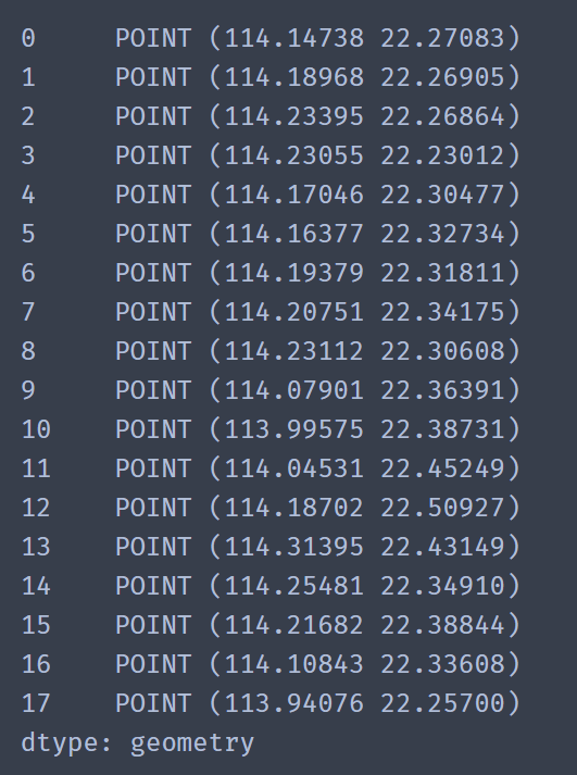 - 区名文本添加:在读取的数据结果中有name 列为对应的区名,使用hk.geometry.representative_point() 方法计算出其代表性 点的经纬度信息用于绘制文本位置,结果如下: