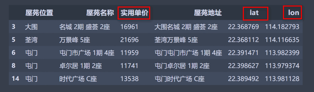 菜J学Python,感谢提供数据支持。由于数据的经纬度是直接基于高德地图进行解析的,导致存在部分数据经纬度信息出错,我们使用pandas进行简单的数据筛选,具体就不再展示,后面会推出系列教程推文,数据预览如下: