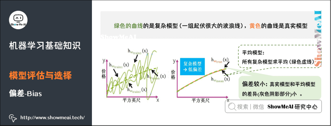 复杂模型的对应的函数千奇百怪,毫无任何规则,但平均模型的函数也是一条平滑的曲线,因此复杂模型的方差很大,并且对数据的变动很敏感。