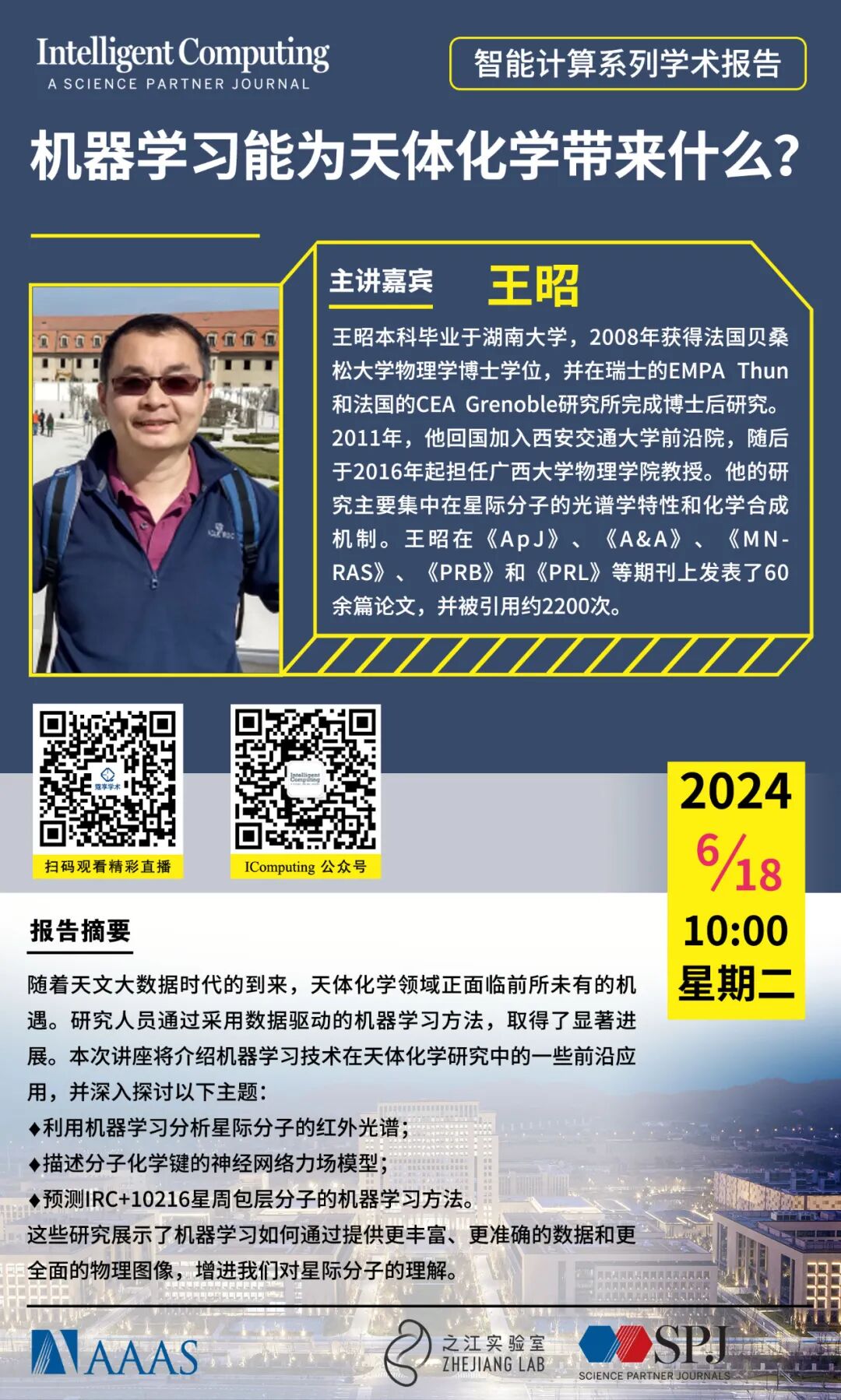 王昭本科毕业于湖南大学,2008年获得法国贝桑松大学物理学博士学位,并在瑞士的EMPA Thun和法国的CEA Grenoble研究所完成博士后研究。2011年,他回国加入西安交通大学前沿院,随后于2016年起担任广西大学物理学院教授。他的研究主要集中在星际分子的光谱学特性和化学合成机制。王昭在《ApJ》、《A&A》、《MNRAS》、《PRB》和《PRL》等期刊上发表了60余篇论文,并被引用约2200次。随着天文大数据时代的到来,天体化学领域正面临前所未有的机遇。研究人员通过采用数据驱动的机器学习方法,取得了显著进展。本次讲座将介绍机器学习技术在天体化学研究中的一些前沿应用,并深入探讨以下主题: