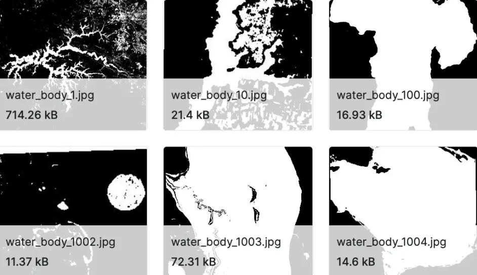 Sentinel-2 卫星拍摄的水体图像集。每张图片都带有一个黑白mask,其中白色代表水,黑色代表除水之外的其他东西。这些掩模是通过计算 NWDI(归一化水差指数)生成的,该指数经常用于检测和测量卫星图像中的植被,但使用更大的阈值来检测水体。