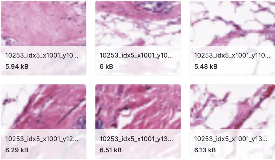 原始数据集包含以 40 倍扫描的 162 个完整的乳腺癌 (BCa) 标本幻灯片图像。从中提取了 277,524 个大小为 50 x 50 的补丁(198,738 个 IDC 负值和 78,786 个 IDC 正值)。每个补丁的文件名格式为:u_xX_yY_classC.png — > example 10253_idx5_x1351_y1101_class0.png。其中 u 是患者 ID (10253_idx5),X 是裁剪此补丁的 x 坐标,Y 是裁剪此补丁的 y 坐标,C 表示类,其中 0 是非 IDC 和1 是数据中心。