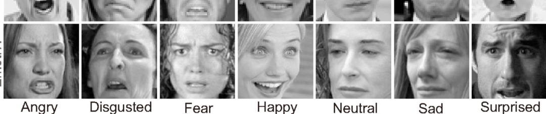 数据由 48x48 像素的人脸灰度图像组成。人脸已自动注册,因此人脸或多或少居中,并且在每张图像中占据大致相同的空间训练集包含 28,709 个示例,公共测试集包含 3,589 个示例。