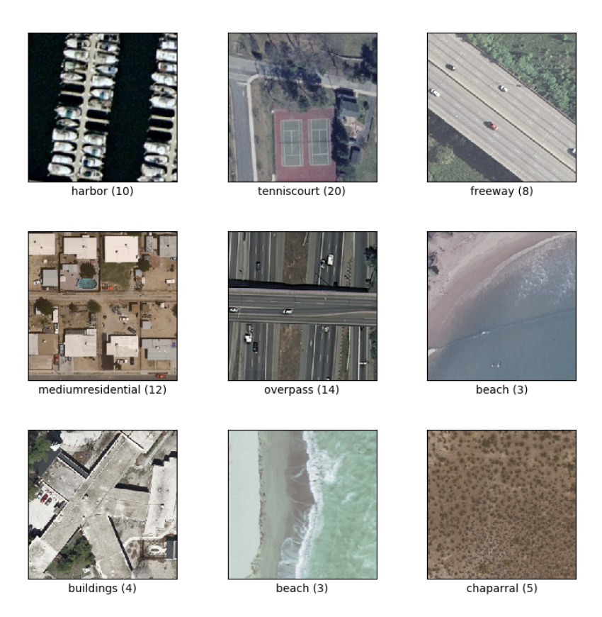 农业 飞机 棒球钻石 海滩 建筑物 丛林 密集住宅 森林 高速公路 高尔夫球场 港口 路口 中型住宅 移动房屋公园 立交桥 停车场 河 跑道 稀疏住宅 储油罐 网球场