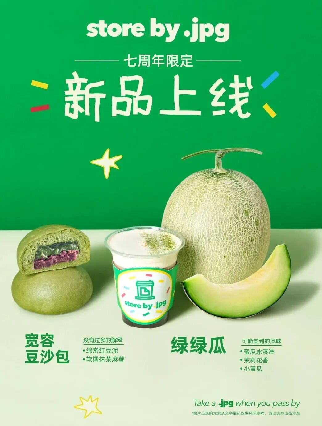 为庆祝品牌诞生七周年,store by .jpg 上线限定新品「宽容豆沙包」,同时饮品「绿绿瓜」 限定回归。「绿绿瓜」 上线全门店,「宽容豆沙包」仅上线烘焙门店。自昨日起, store by .jpg 全门店同步上线七周年限定挂件&杯套纸袋。购入「绿绿瓜」或「宽容豆沙包」加 7.7 元,或下单「绿绿瓜·含周边」,即可获得 7 周年限定挂件一个。