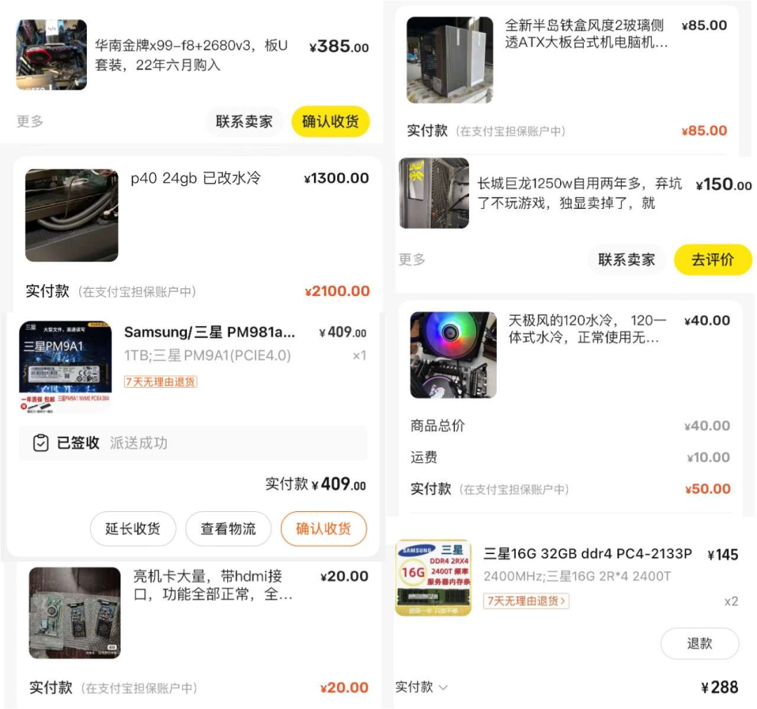 目前配置一共花了 3400(双 P40 显卡),不追求完美 3000 应该也能配下来。p40 性能大约在 1080ti 左右,3090 的 1/2,4090 的 1/4。去年 23 年底大约 650 一张,现在(24 年初)涨到到900左右。▲ 购买记录