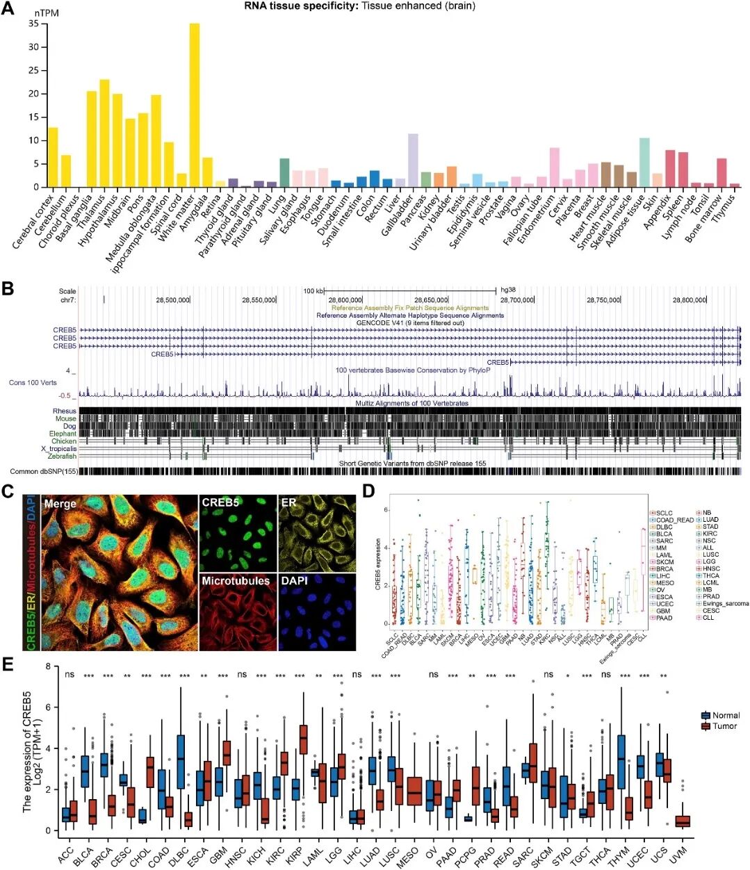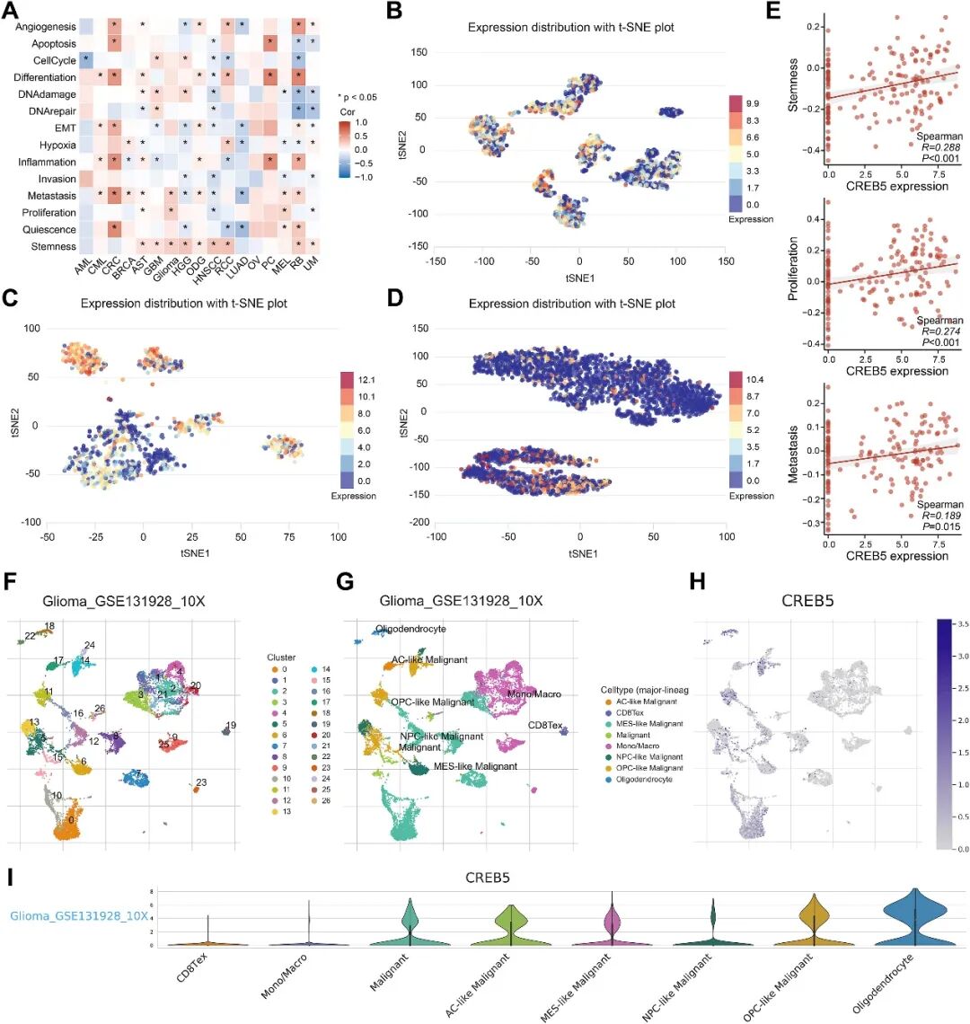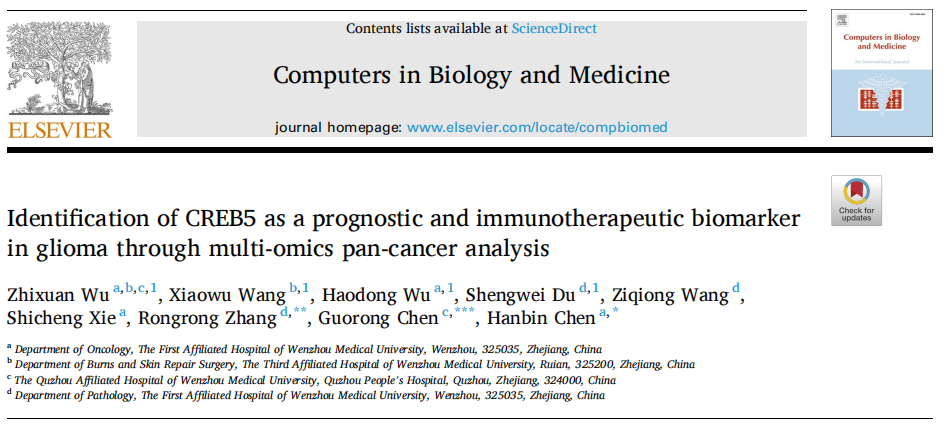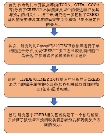 l题目:通过多组学泛癌分析,确定CREB5作为胶质瘤的预后和免疫治疗性生物标志物l杂志:Computers in Biology and Medicinel影响因子:6.7l发表时间:2024年2月公众号回复“原文”二字可以领取本文献,文献编号240619 研究背景CREB5是cAMP-response element-binding protein家族的一个成员,其在多种癌症发展和进展中都起重要作用。然而,CREB5的泛癌功能及其临床价值尚未得到全面深入的研究。本文采用多组学整合分析的方法,对CREB5在泛癌背景下的表达模式、预后价值、基因突变谱及其与肿瘤微环境、免疫浸润等的关系进行了全面探索。同时,文章还通过体内实验验证了CREB5在胶质瘤中的生物学功能。这为CREB5在肿瘤诊断和治疗中的应用提供了新的证据。数据来源