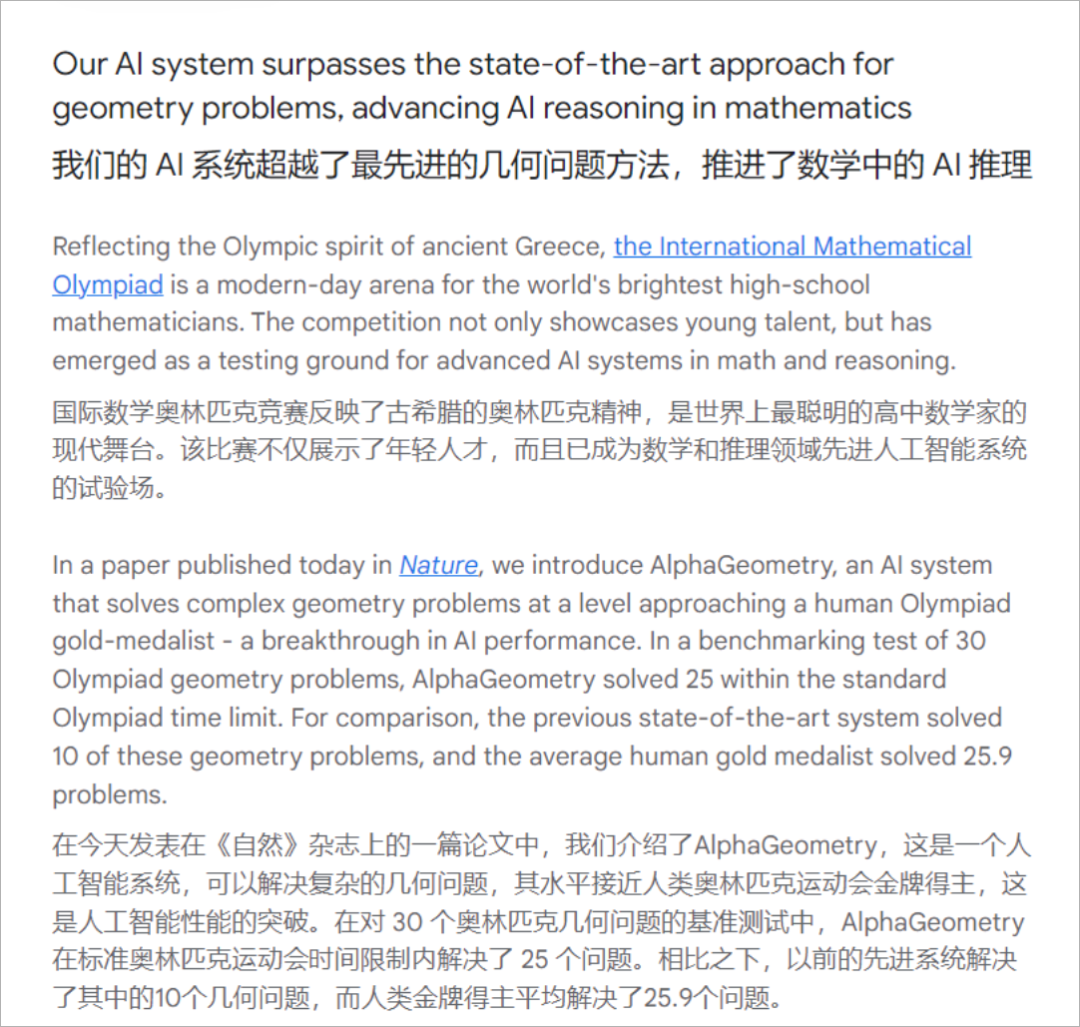 就像今年1月登上Nature的炸裂级研究,谷歌DeepMind的AlphaGeometry,在30题的范围内,能够答出25道国际数学奥林匹克几何题,人类金牌得主平均解决了25.9个问题。