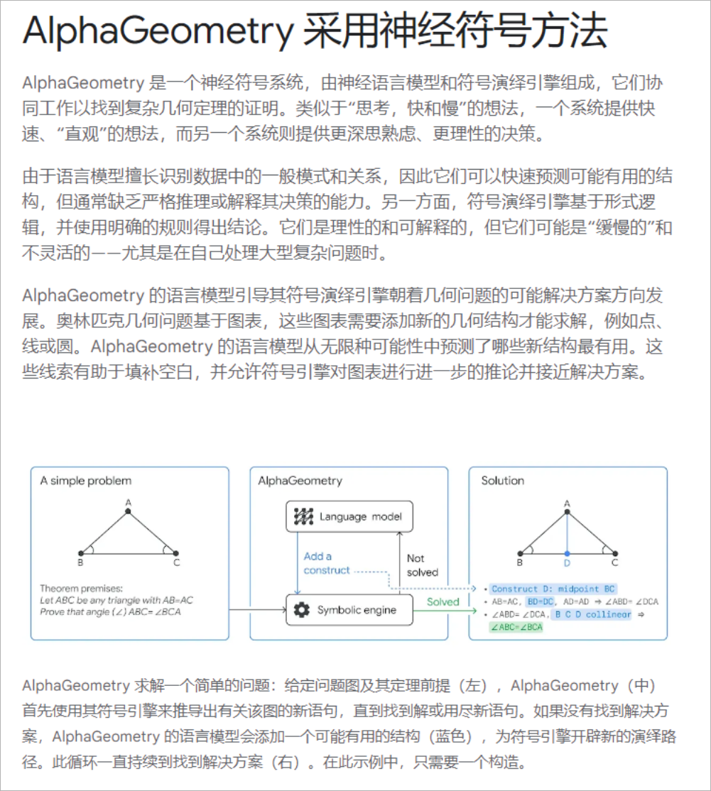 而这胜利背后,是AlphaGeometry的团队,构建了神经语言模型与符号演绎引擎这两个系统,尝试提高模型的推导能力。