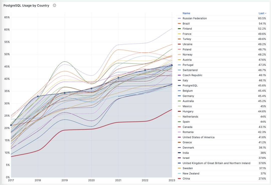 当然这里值得注意的是 中国(标粗红线),PostgreSQL 的使用率远低于全球平均水平,而 MySQL 使用率远高于全球平均水平。整体数据库生态大概是全球 10 - 15 年前的状态。