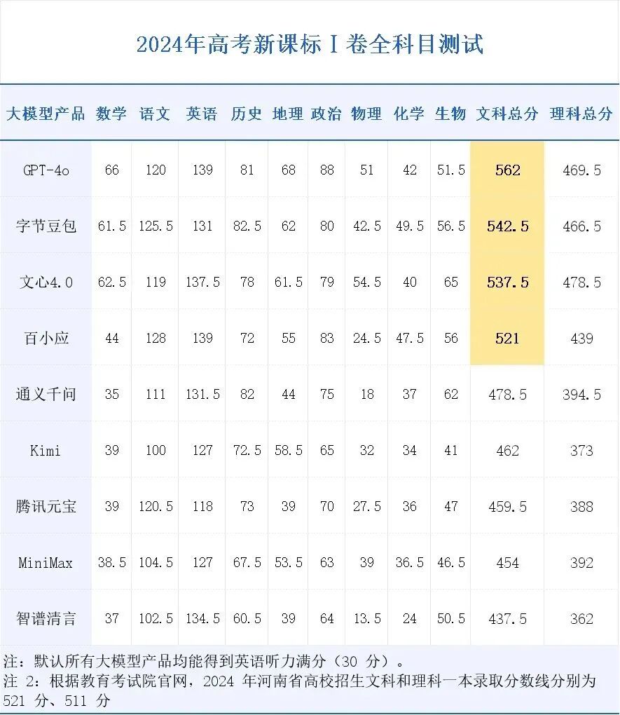 测试结果显示,OpenAI的ChatGPT(使用GPT-4o)总分最高,文科562分,理科469.5分。作为参考,2024年河南文科一本线521分,二本428分;理科一本511分,二本396分。根据公开的一分一段表,ChatGPT文科成绩在河南省的排名为8811,相当于人类考生的前2.45%;理科排名为202264,相当于前35.27%。参加测试的大模型整体呈现文科强,理科弱的趋势。大模型在语文、英语(听力默认满分)中表现出色,语文作文水平已经超出了人类考生的平均水平。数学考试中,大模型仅能在客观题部分拿到一些分数,主观题部分几乎全军覆没。文综中,历史和政治两科有多个大模型能达到80%以上的得分率,地理表现较差,可能是因为地理对图片识别、逻辑思维的要求较高。理综中,大模型的物理和化学全都不及格,平均分分别为39和34(满分是110和100),生物得分率较高,但也仅有两个过了及格线(54分)。(极客公园)
