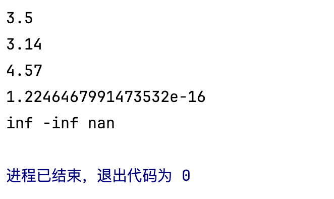 最后,定义了三个特殊的浮点数值:正无穷大、负无穷大和非数值。使用print函数打印出h、i、j的值,分别为inf、-inf、nan。