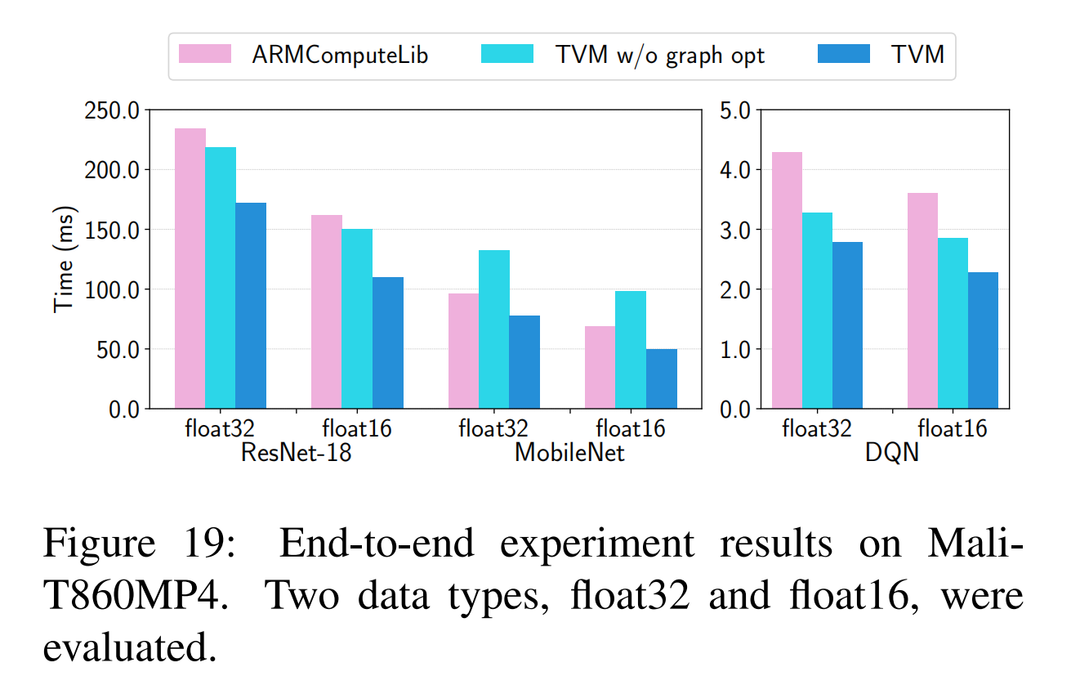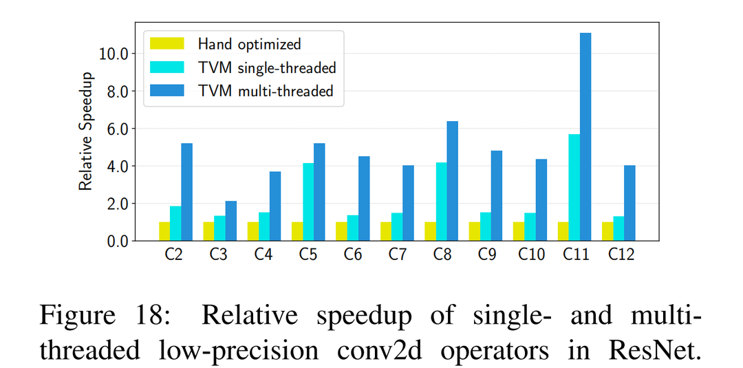 此外,引入了张量调度原语,以用相应的内在函数替换计算单元。编译器将计算模式与硬件声明相匹配,并将其降低到相应的硬件内在特性。张量化将调度与特定的硬件原语分离,从而 可以轻松扩展 TVM 以支持新的硬件架构。生成的张量调度代码符合高性能计算特性:将复杂的算子分解为一系列 micro-kernel 调用。咱们还可以使用 tensorize 原语来利用手工设计的 micro-kernel,这在某些平台上可能是有益的。例如,通过利用 bit-serial 矩阵向量乘法 micro-kernel 为移动 CPU 实现超低精度算子,这些算子对一比特或两比特宽的数据类型进行操作。这个 micro-kernel 将结果累积成越来越大的数据类型,以最大限度地减少内存占用。将 micro-kernel 表达为 TVM 固有的张量 与 非张量化版本相比 可产生高达1.5倍的加速。
