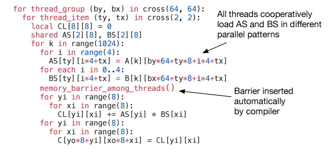 如果没有显式内存范围,自动范围推理会将计算阶段标记为 thread-local。共享任务必须计算组中所有工作线程的依赖关系,此外还必须正确插入内存同步屏障,以保证共享加载的数据对消费者可见。最后,除了对 GPU 有用之外,内存范围还让咱们可以标记特殊的内存缓冲区,并在针对专门的 DL 加速器时创建特殊的降低规则。