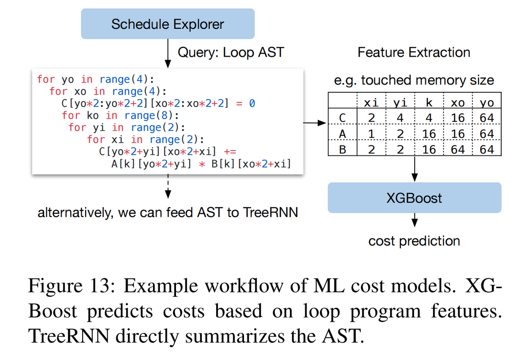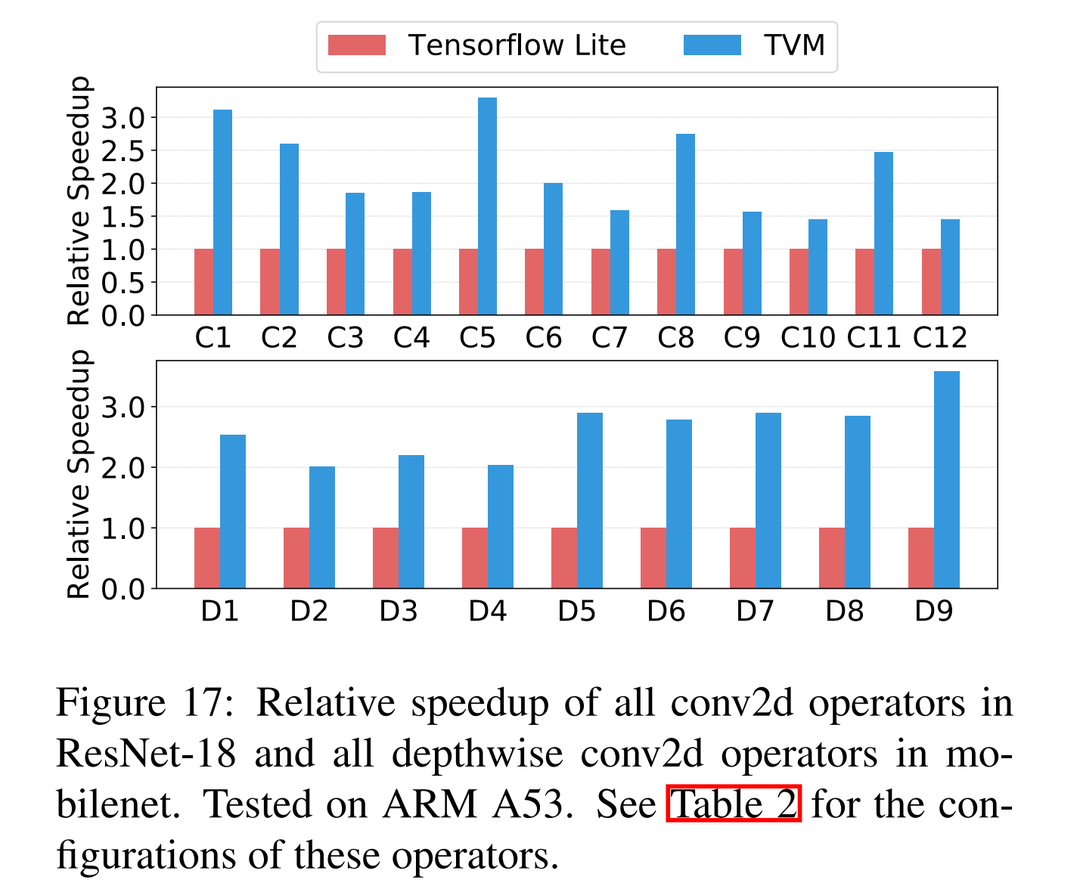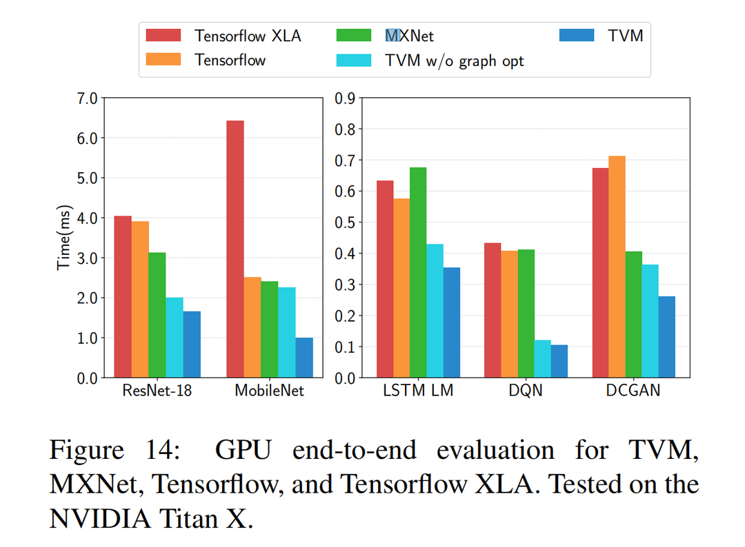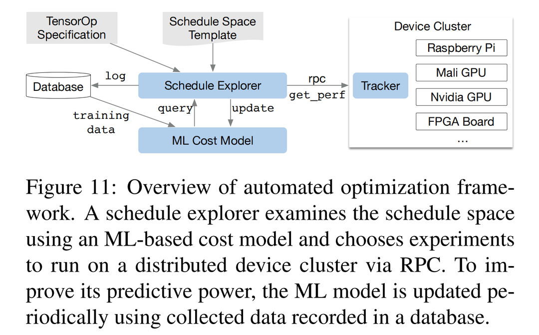 TVM 通过在每个硬件后端生成许多有效的实现并选择优化的实现,为每个算子生成高效的代码。这个过程建立在 Halide 将描述和计算规则 (或调度优化) 解耦的想法的基础上,并将其扩展为支持新的优化 (嵌套并行、张量和延迟隐藏) 和 广泛的硬件后端。