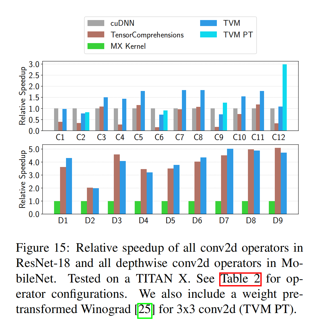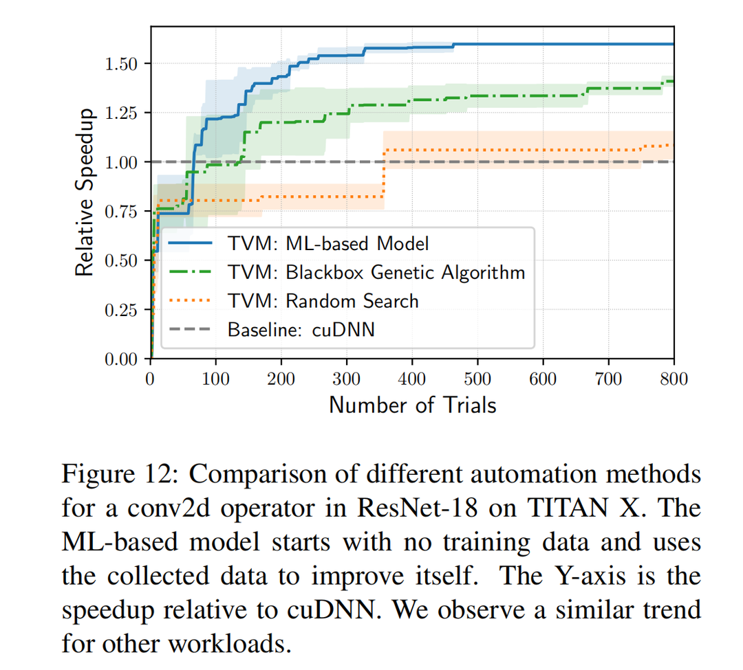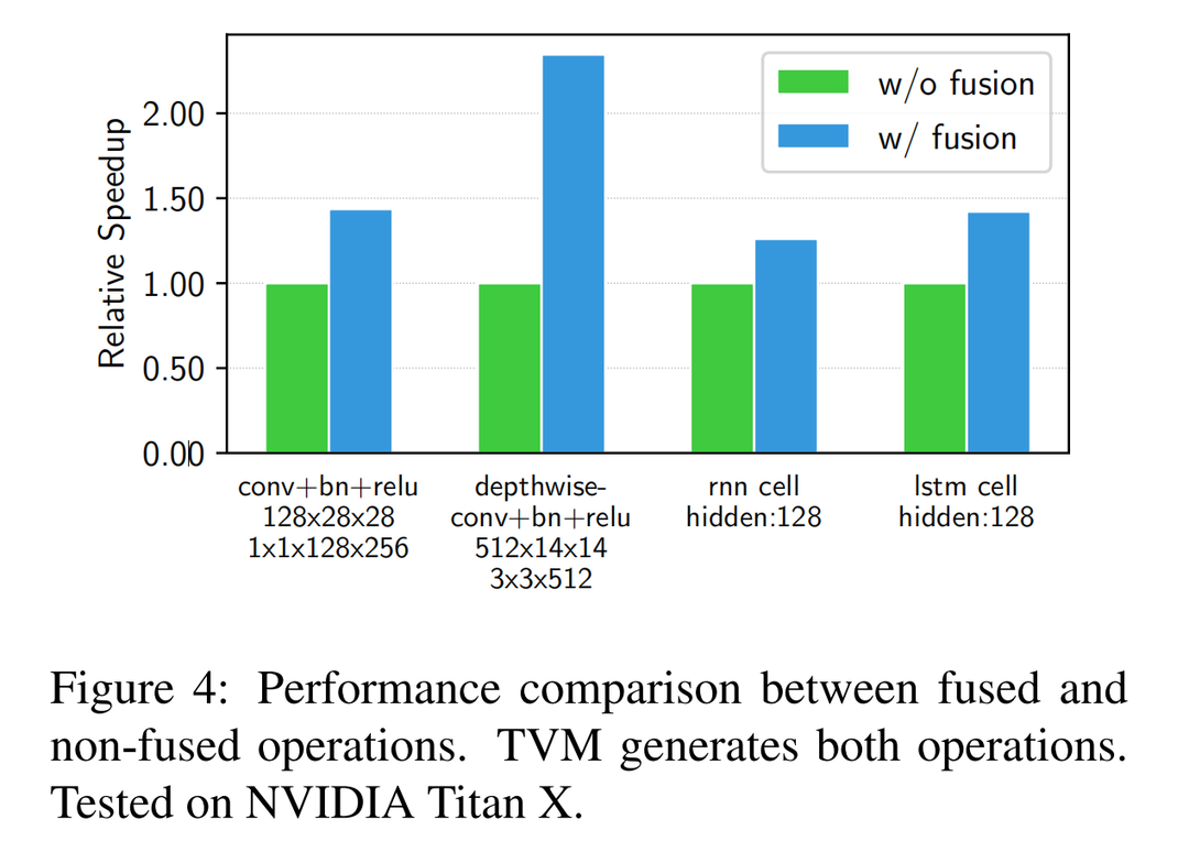 TVM 通过在每个硬件后端生成许多有效的实现并选择优化的实现,为每个算子生成高效的代码。这个过程建立在 Halide 将描述和计算规则 (或调度优化) 解耦的想法的基础上,并将其扩展为支持新的优化 (嵌套并行、张量和延迟隐藏) 和 广泛的硬件后端。