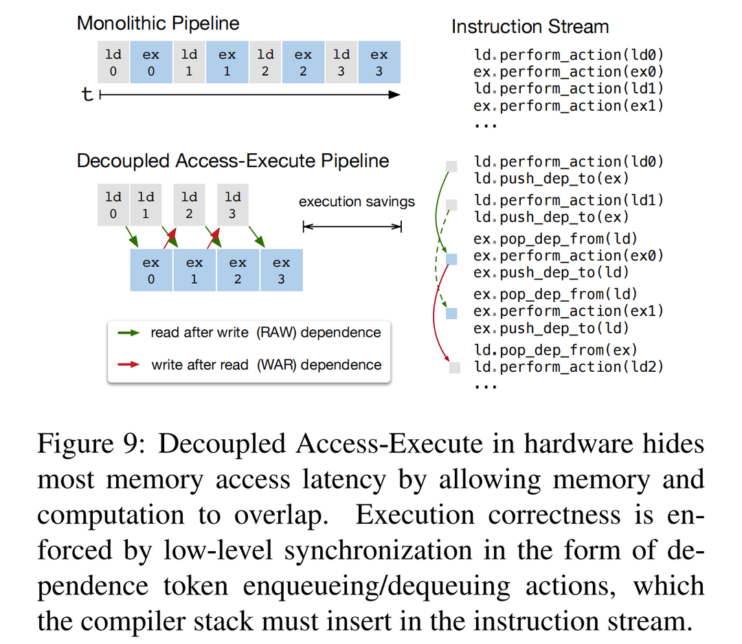 图9显示了减少运行时延迟的 DAE 硬件管道。与单片硬件设计相比,流水线可以隐藏大部分内存访问开销,几乎可以充分利用计算资源。为了实现更加高的利用率,指令流必须增加细粒度的同步操作。没有它们,就无法强制执行依赖关系,从而导致错误执行。因此,DAE 硬件流水线需要在流水线阶段依赖于细粒度的入队/出队操作,以保证正确执行,如图9的指令流所示。