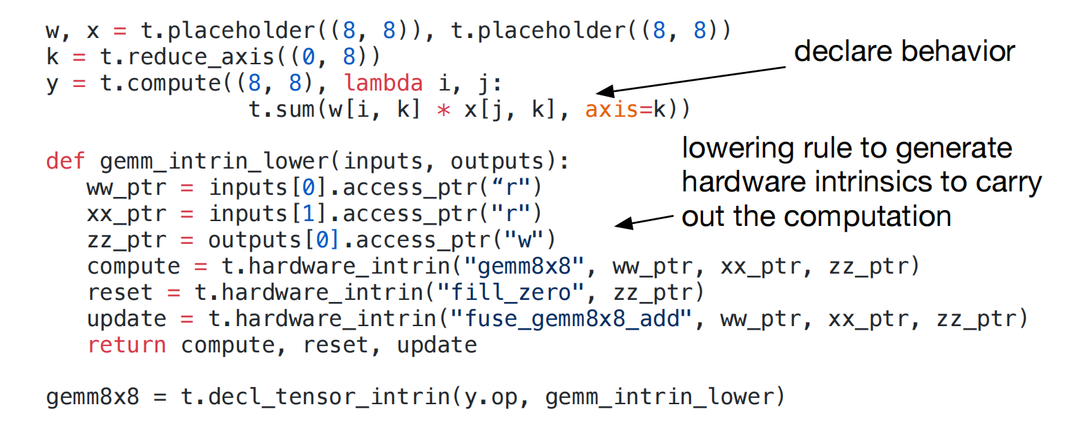通过使用张量内在声明机制将目标硬件内在特性 与 调度分离,从而使张量化变得可以扩展。作者使用相同的张量表达式语言来声明每个新硬件内在行为 和 与之相关的降低规则。以下代码展示了如何声明一个 8x8 张量的硬件内在函数。