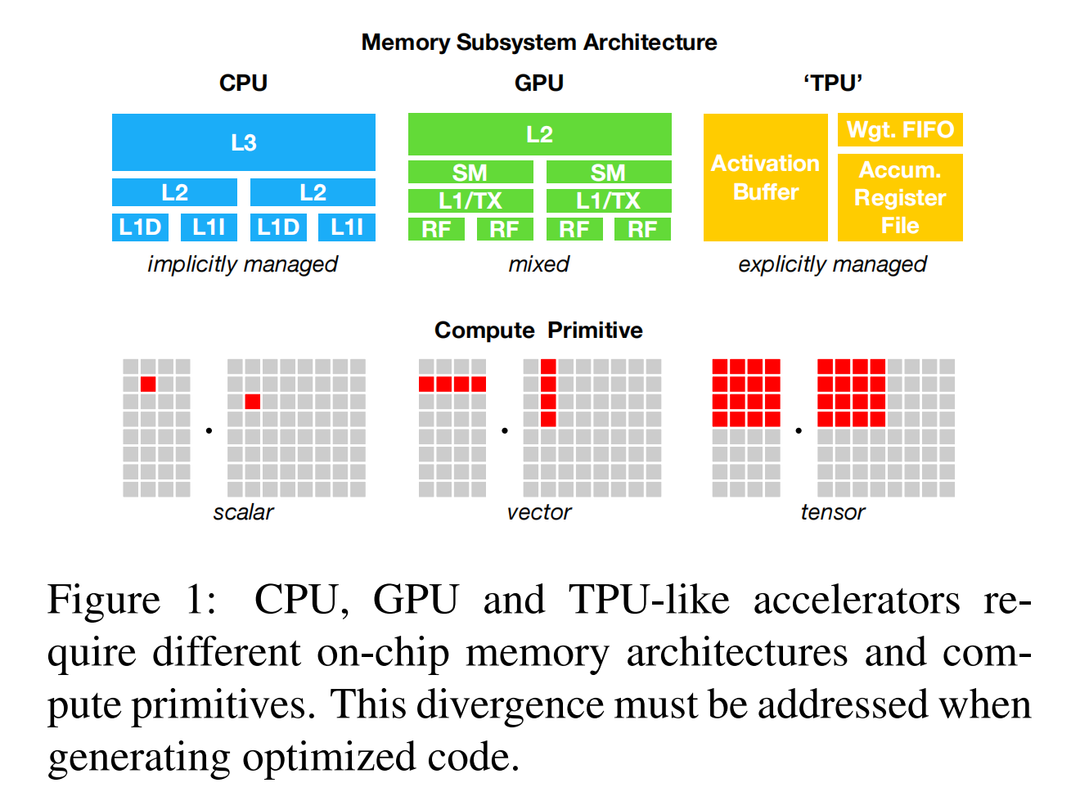 DL 工作负载具有很高的算术强度,通常可以分解为张量算子,如矩阵乘 或 一维卷积。这些自然分解导致了最近添加的张量计算原语的趋势。这些新的原语为基于调度的编译创造了机遇和挑战,使用它们可以提高性能,所以编译框架必须无缝的集成它们。这种张量化类似于 SIMD 架构的矢量化,但又有着显著差异。指令输入是多维的,具有固定或可变的长度,并且具有不同的数据排布。更为重要的是,这种原语不能是固定的,因为新的加速器有可能会出现张量指令的变体,因此需要一个可扩展的解决方法。
