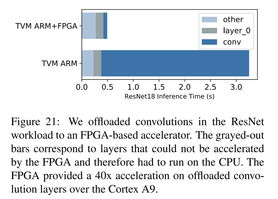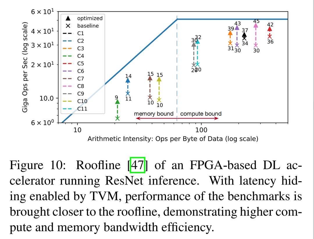 Hardware Evaluation of Latency Hiding 展示了延迟隐藏在基于 FPGA 的定制加速器设计上的有效性。在加速器上运行 ResNet 的每一层,并使用 TVM 生成两个调度:一个有延迟隐藏,一个没有。具有延迟隐藏的调度将程序与虚拟线程并行化 以进行管道并行,从而隐藏了内存访问延迟。结果在图10 中显示为 roofline图表;roofline性能图可以深入了解给定系统在不同基准测试中使用计算和内存资源的情况。总体而言,延迟隐藏提高了所有 ResNet 层的性能。峰值计算利用率从没有延迟隐藏的 70% 提高到了隐藏延迟的 88%。