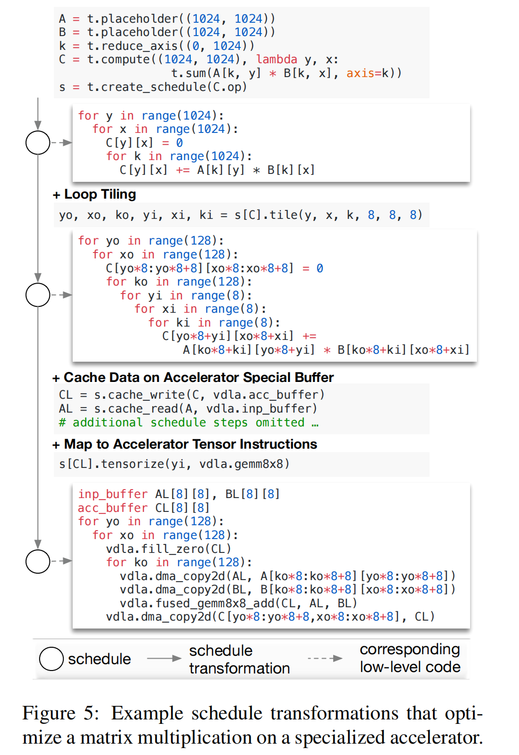 通过增量应用保持程序逻辑等价的基本转换 (调度原语) 来构建调度。图5展示了在专用加速器上调度矩阵乘法的示例。在内部,TVM 应用调度转换,使用数据结构来跟踪循环结构和其他信息。然后此信息可以帮助按给定的最终调度生成低级代码。