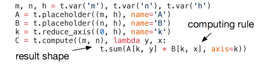引入了张量表达式语言来支持自动代码生成,与高级计算图表示不同,张量算子的实现是不透明的,每个算子都用索引公式表达语言来描述。以下代码展示了计算转置矩阵乘法的示例张量表达式。