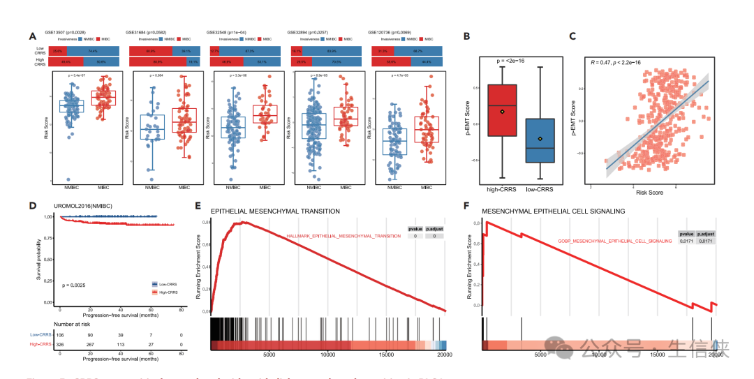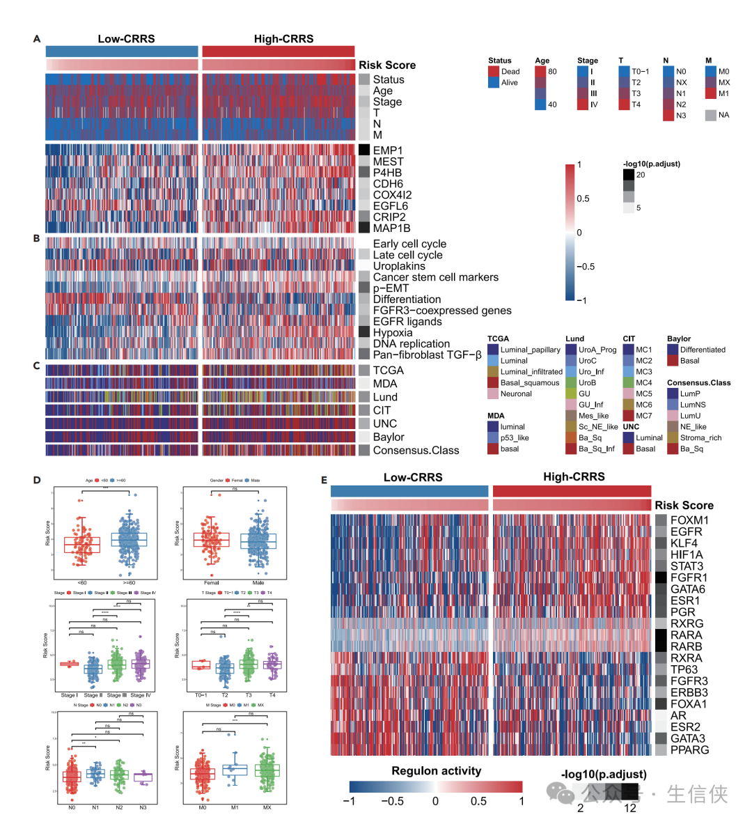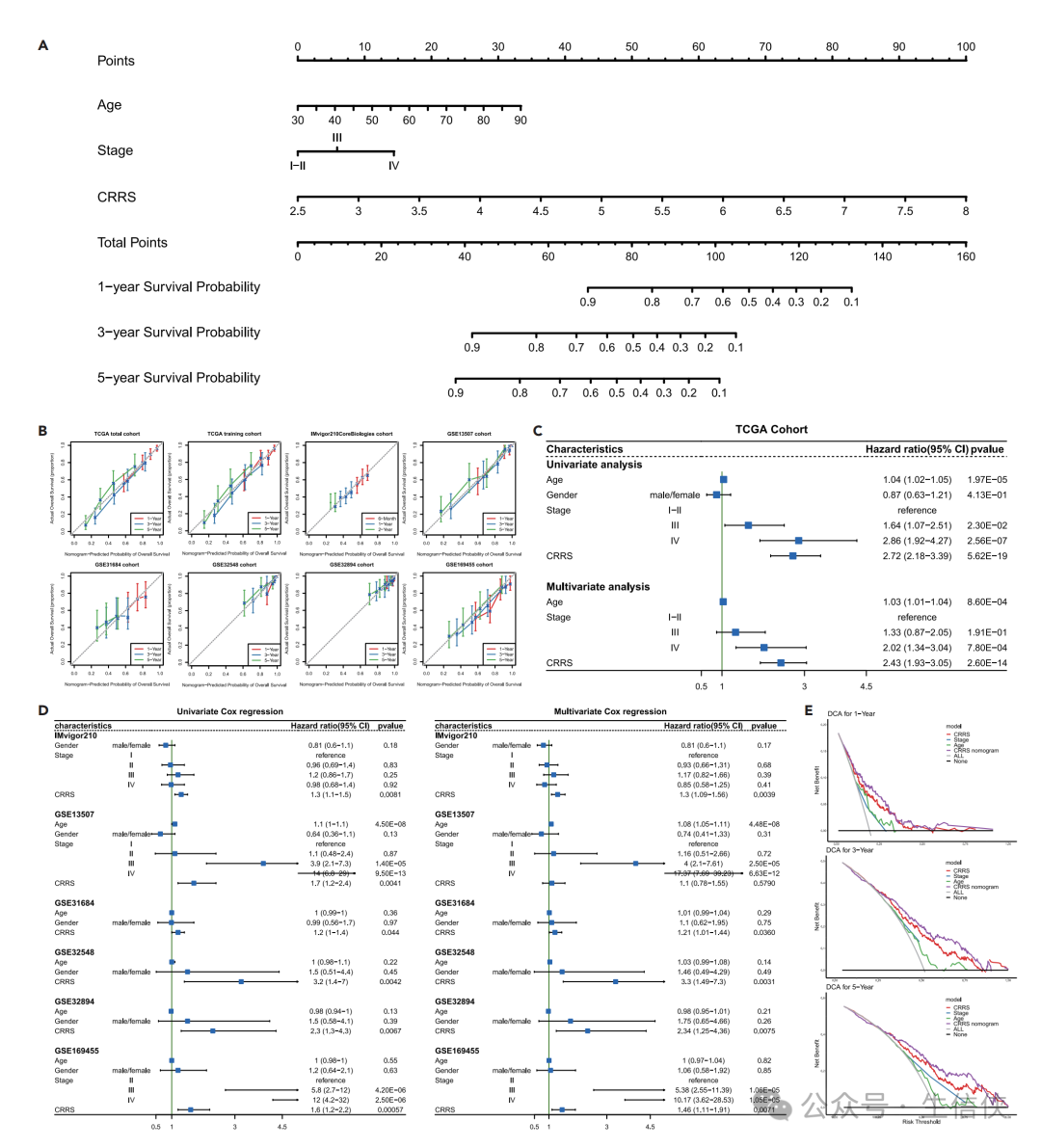 与其他临床病理参数相比,ROC曲线显示CRRS具有更强的预测能力(图2D-H)。 作者根据TCGA队列中CRRS、年龄和病理分期的多变量Cox回归结果构建了NOMOGRAM模型(图3A)。结果表明NOMOGRAM模型通过校准曲线对BLCA患者的OS有较高的准确度(图3B)。TCGA-BLCA队列(图3C)和6个外部验证队列(图3D)的单因素和多因素Cox回归表明,CRRS可以作为BLCA患者的独立预后因素。此外,决策曲线分析(DCA)表明,NOMOGRAM显著优于单个独立的预测参数(图3E)。总之,NOMOGRAM对BLCA患者具有潜在的预后预测价值。 随后作者评估了CRRS与临床病理特征的相关性(图4)。在TCGA队列中,年龄大于60和TNM晚期的BLCA患者的风险评分更高。CRRS调控基因在高CRRS组和低CRRS组中存在差异表达。在高CRRS组中,p-EMT、DNA复制和TGF-b信号通路显著富集;而在低CRRS组中,分化通路FGFR3共表达基因富集。靶向上述通路可能使高CRRS组的患者受益。作者进一步探讨了CRRS与BLCA中7个经典亚型的相关性。结果表明低CRRS的BLCA患者更可能为腔型,高CRRS组为基底型。与BLCA相关的23个转录因子的调控活性存在显著差异。与肿瘤促进相关的转录因子在高CRRS组中高于低CRRS组。 接着作者研究了EMT与CRRS的相关性。结果显示,肌肉浸润性膀胱癌(MIBC)中CRRS