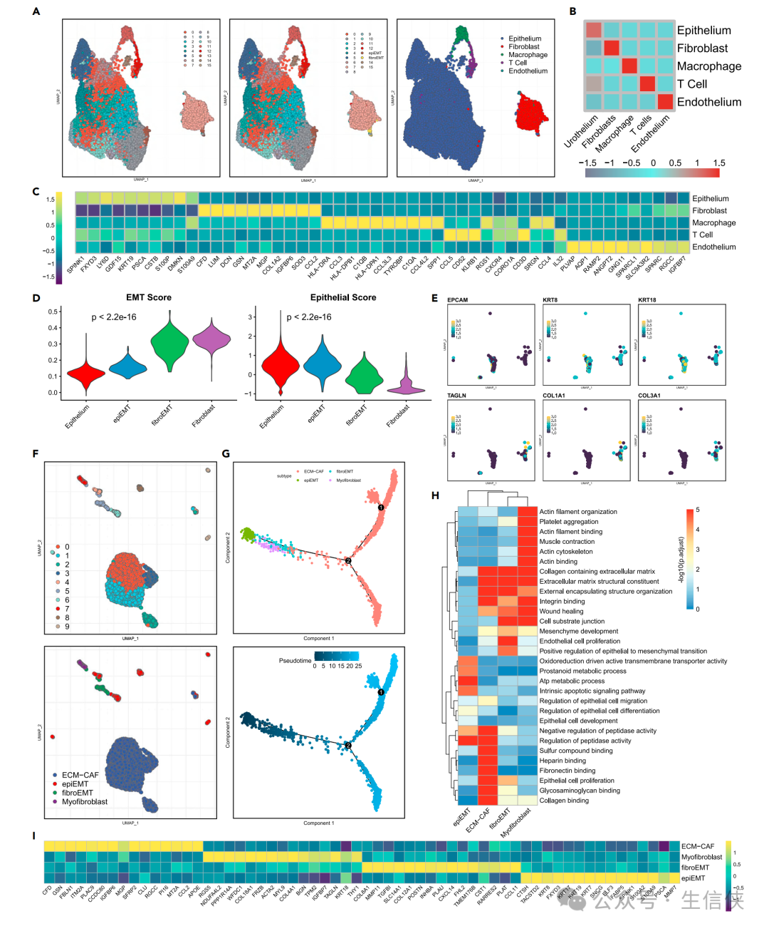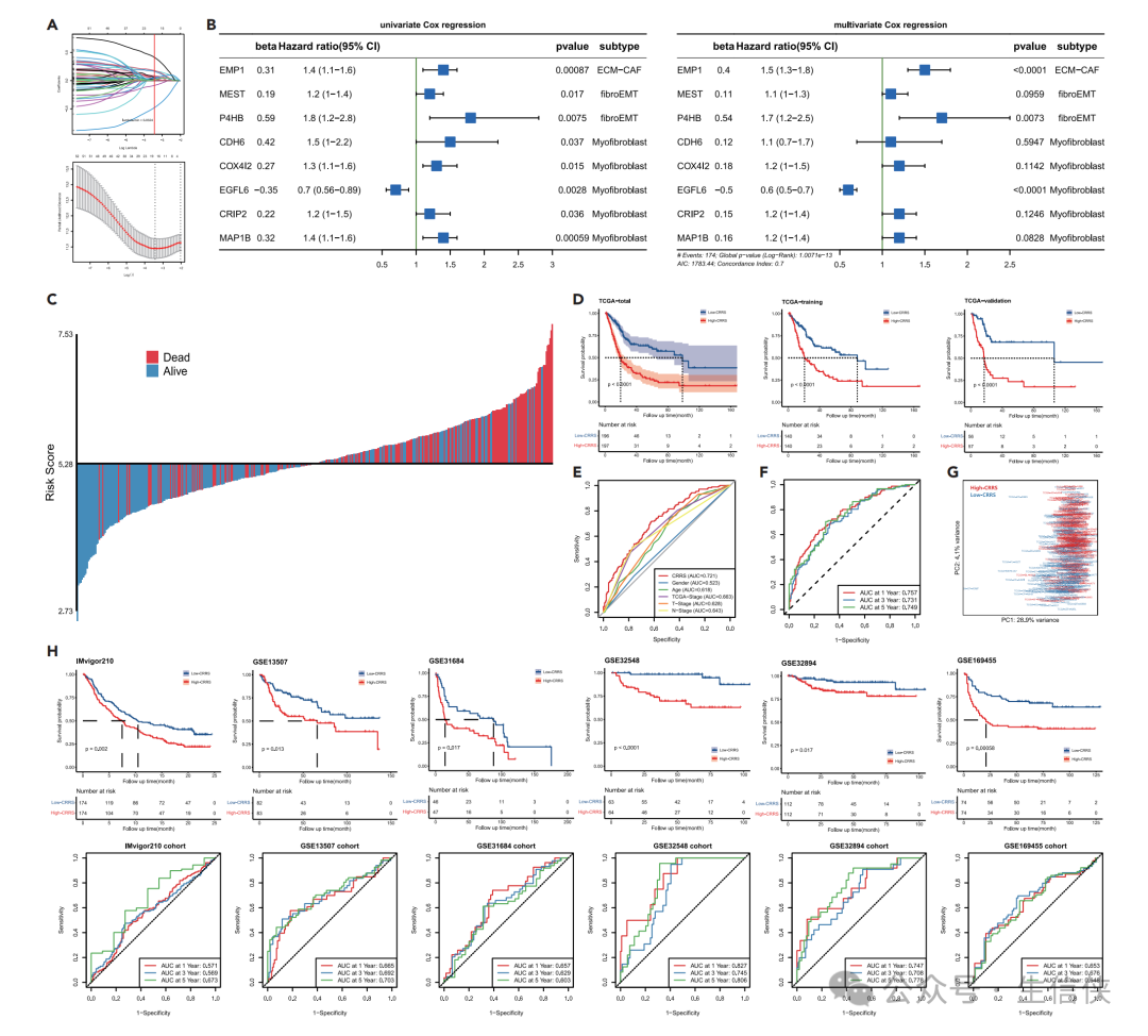 作者收集了BLCA患者及其对照的scRNA-seq数据集。根据特定的细胞标记因子,上述细胞簇被划分为五种主要的细胞类型并计算了其得分和主要差异表达基因(图1A-C)。EMT评分和上皮评分结果表明,EMT评分从上皮和epiEMT到纤维EMT和成纤维细胞逐渐升高(图1D-E)。2362个成纤维细胞被分为三个不同的亚群ECM-CAF、fibroEMT和myofi-broblast(图1F)。细胞轨迹分析表明epiEMT细胞数量减少,而ECM-CAF细胞数量增加(图1G)。GSEA富集表明与细胞外基质相关的通路在所有三种CAF亚型中都富集(图1H);各CAF亚型差异表达前15位的基因热图如图1I所示。 采用单因素Cox回归分析和LASSO算法筛选与CAF相关的预后基因,最后确认了18个候选标记(图2A)。随后作者基于18个候选标记构建了102714个签名,进行多变量Cox回归并绘制随时间变化的ROC曲线,并引入外部队列对每个特征进行检验。最后,综合选择8个CAF相关标志物作为BLCA患者的最佳预后标志(图2B)。根据8种标志物的表达水平及多变量Cox回归系数计算CAF相关风险评分(CRRS)。结果表明,高CRRS患者的预后明显差于低CRRS患者(图2C)。