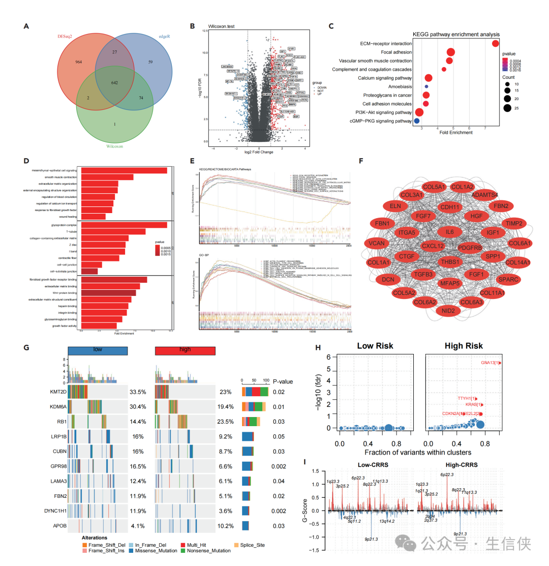 水平高于非肌肉浸润性膀胱癌(NMIBC),并且高CRRS组中MIBC的比例高于低CRRS组(图5A);同样的高CRRS组的EMT评分显著增加(图5B)。CRRS也与p-EMT评分呈正相关(图5C)。此外,生存分析还显示,在UROMOL2016队列中,高CRRS患者的无进展生存期比低CRRS患者短(图5D)。GSEA富集分析发现EMT信号通路在高CRRS组显著激活(图5E-F)。TME影响肿瘤的进展和免疫治疗的效果。因此作者首先研究了CRRS与免疫细胞浸润的相关性。结果显示,在高CRRS组中,几种抗癌肿瘤浸润免疫细胞(TIICs)表达显著下调(图6AC)。此外,作者发现在TCGA队列中,CRRS与TIDE评分、T细胞排斥和功能障碍评分呈正相关(图6D)。ROC曲线显示CRRS对ICB完全反应具有较强的预测能力(图6E-F)。黑色素瘤免疫治疗队列GSE91061的结果也显示高CRRS组免疫治疗的缓解率明显低于低CRRS组(图6G)。 在该研究中,研究团队通过3种不同的方法相交得到642个共同的DEG(图7A),在火山图中筛选了最显著的DEG(图7B)。基于KEGG和GO数据库的富集结果表明,上调的DEG在ECM受体相互作用、局灶黏附、含胶原的细胞外基质和间充质上皮细胞信号传导等生物学途径中富集(图7C-D)。GSEA分析与KEGG和GO富集结果一致(图7E-F)。高CRRS组RB1和APOB的突变率显著升高(图7G)。此外,在高CRRS组中检测到GNA13、TTYH1、KRAS、CDKN2A和NFE2L2等癌驱动基因,而在低CRRS组中未检测到这些基因(图7H-I)。 引入外部队列进一步验证了CAFs相关风险评分在预测预后中的作用。CRRS评分高的患者总生存期短于CRRS评分低的患者(图8A-B)。单因素和多因素cox回归分析也发现CRRS是独立的预后因素(图8C)。CRRS预测1年、3年和4年OS的ROC曲线AUC分别为0.846、0.71和0.788(图8D)。该团队选择EMP1、P4HB和EGFL6进行进一步的实验验证。