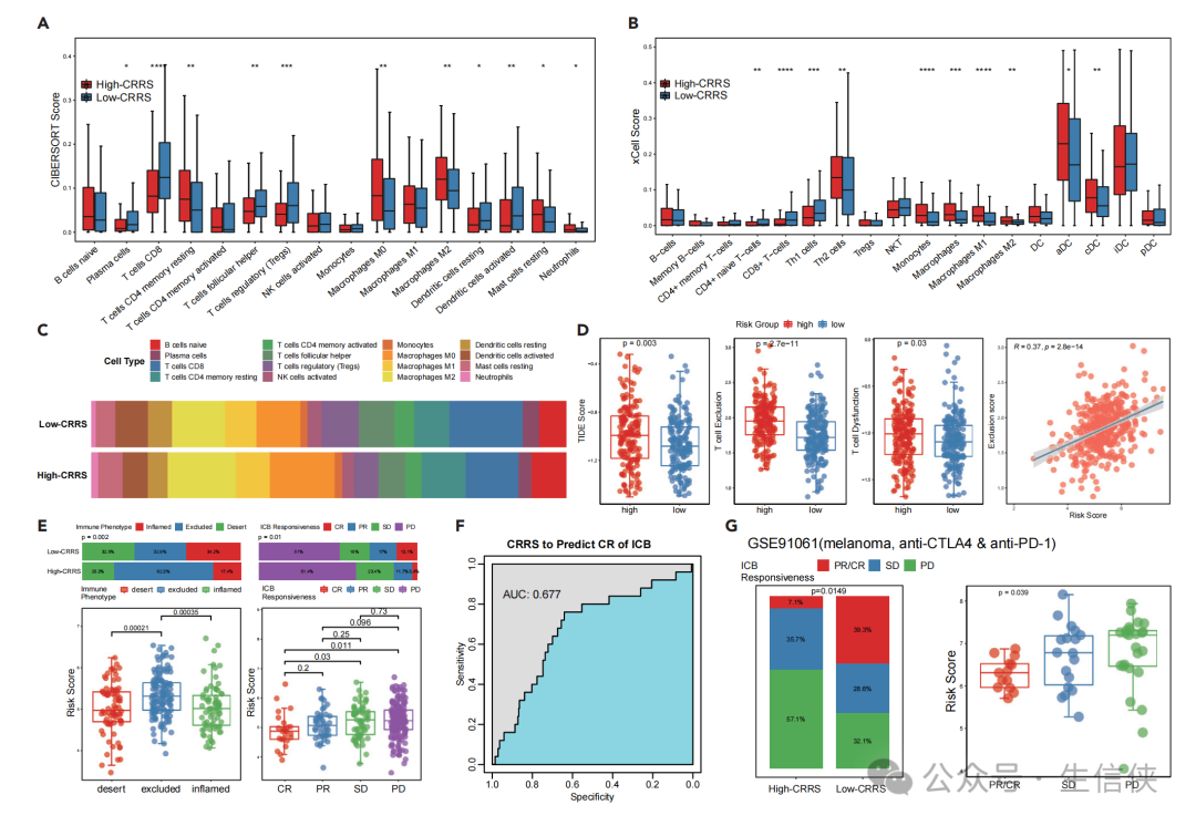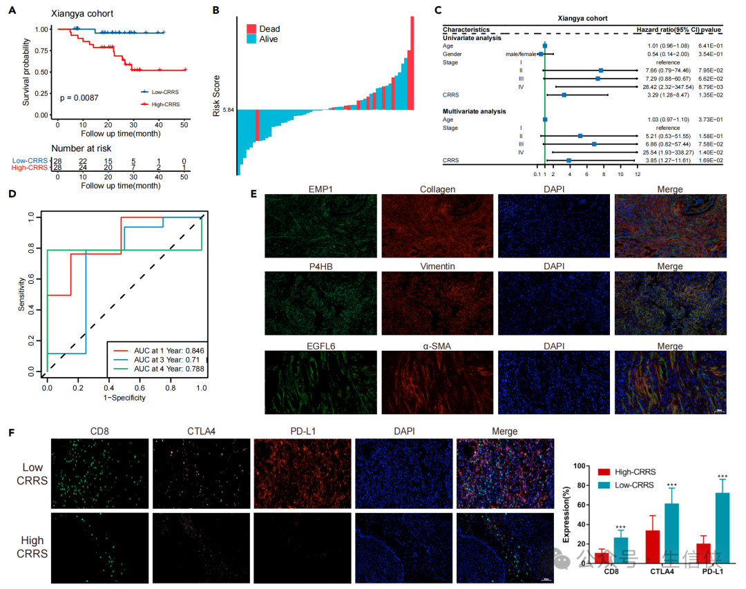 免疫荧光结果显示,EMP1、P4HB和EGFL6是特异性CAF亚型的显著标记物(图8E)。与低CRRS组相比,高CRRS组CD8、PD-L1和CTLA4的表达较低,这表明CRRS与非炎症表型显著相关(图8F)。 在这个研究中,作者借助多组学数据研基于CAFs亚型构建了CAF相关风险评分(CRRS),为BLCA患者的预后和免疫治疗提供新的见解。文章最为突出的是系统的生物信息学分析,并再对模型进行了验证。不过该研究仍然存在一些局限性,肿瘤内遗传异质性和样本偏倚大和是从从基于公共数据集的回顾性数据中获得CAF亚型和与CAF相关的风险特征。当然,这篇文章仍不失为是一篇佳作,如此系统且环环相扣的文章小伙伴们就不要错过了,小侠也在此恭候,随时解答问题,还在等什么呢?动动小手和小侠约起来吧!