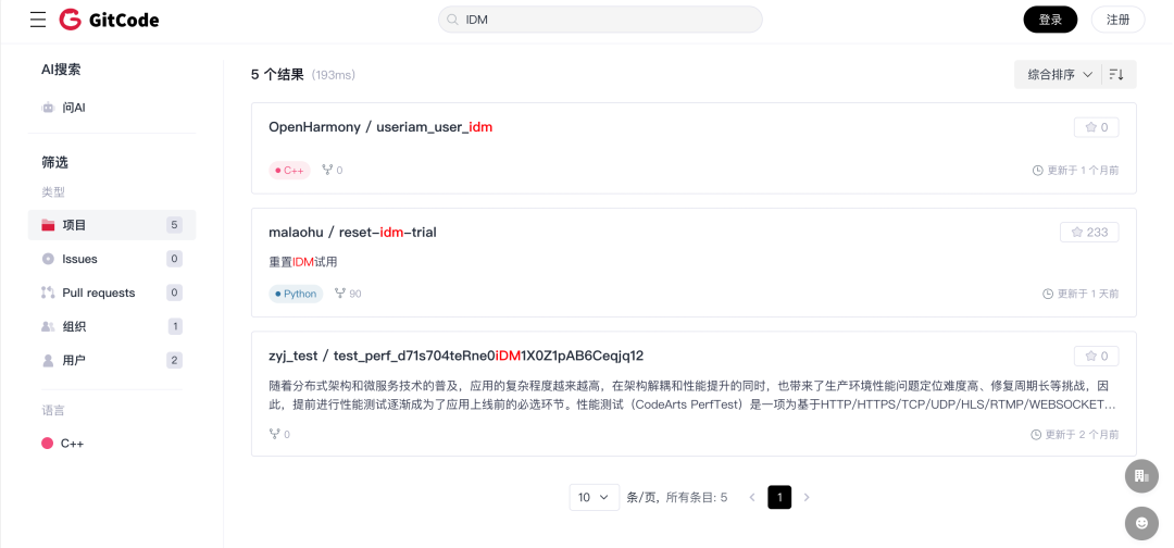 而 GitCode 上目前有一个比较奇怪的现象,例如这里搜索关键字IDM,左边会显示有5个项目,而右边的搜索结果却只有3个。原因究竟是网站检索规则有 bug,还是 GitCode 迫于压力隐藏了部分内容,这就不得而知了。