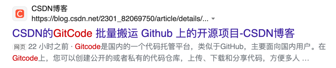 咱们耳熟能详的“同性交友网站”除了老大哥 GitHub 外,国内开发的 Gitee 也算是小有名气。GitCode 大概是想要对标它们俩,但选择了这样一种方式,通过搬运,平台的内容在短时间内变得极其丰富,再通过一些搜索引擎优化手段(CSDN的传统艺能了),提高 GitCode 在搜索引擎规则下的权重。此时如果通过搜索引擎检索,GitCode 自然会在很多地方探头,这就达到了提升知名度的目的。